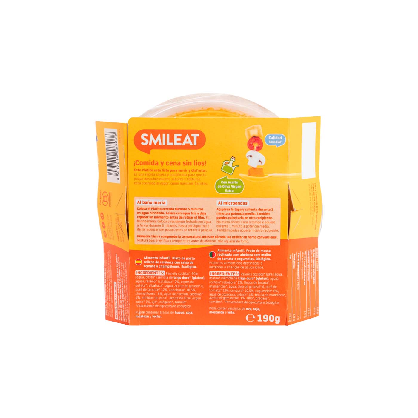 Es un alimento infantil ecológico de Smileat, presentado en un práctico formato de 190g. Contiene raviolis de calabaza con salsa de tomate y champiñones, enriquecido con aceite de oliva virgen extra. Es una opción nutritiva diseñada para bebés a partir de los 15 meses.