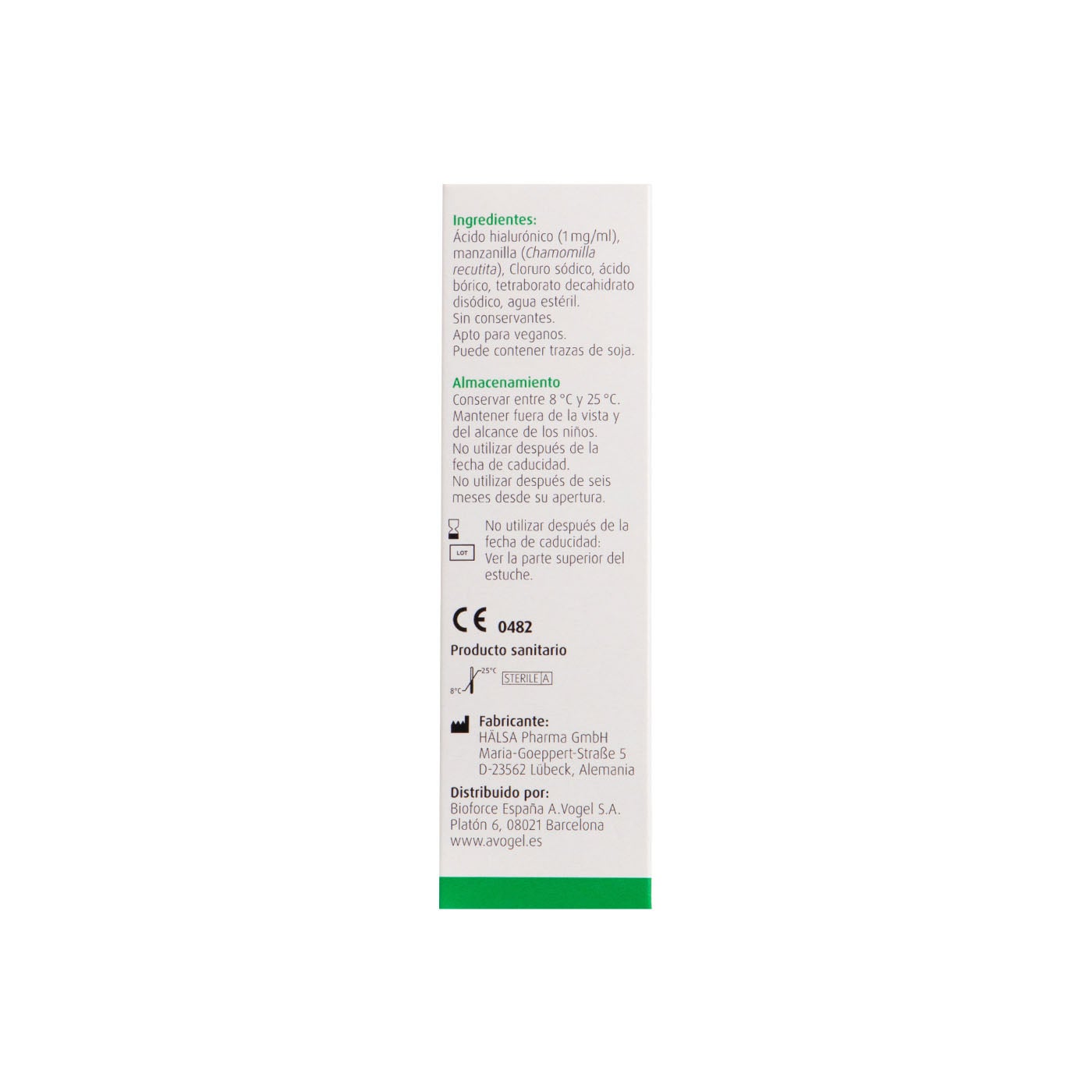 Ácido hialurónico (1 mg/ml), manzanilla (Chamomilla recutita), cloruro sódico, ácido bórico, tetraborato decahidrato disodico, agua estéril. Puede contener trazas de soja.