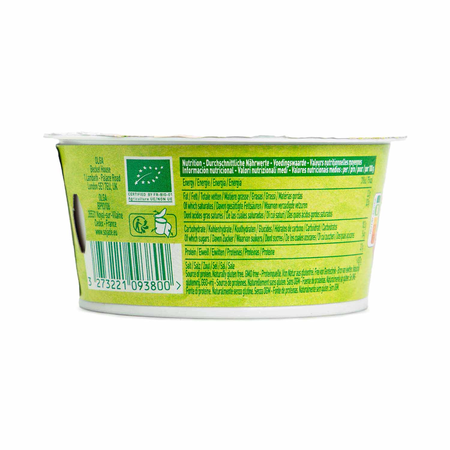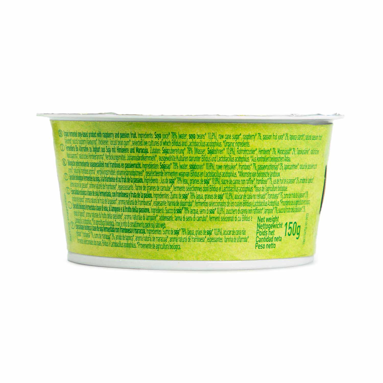Bebida de soja* 78 %, azúcar de caña sin refinar*, frambuesa* 7 %, zumo de maracuyá* 2 %, almidón de tapioca*, aroma natural de maracuyá*, zumo concentrado de saúco*, aroma natural de frambuesa*, espesante: harina de algarroba*, fermentos seleccionados de los cuales Bifidus y Lactobacillus Acidophilus.