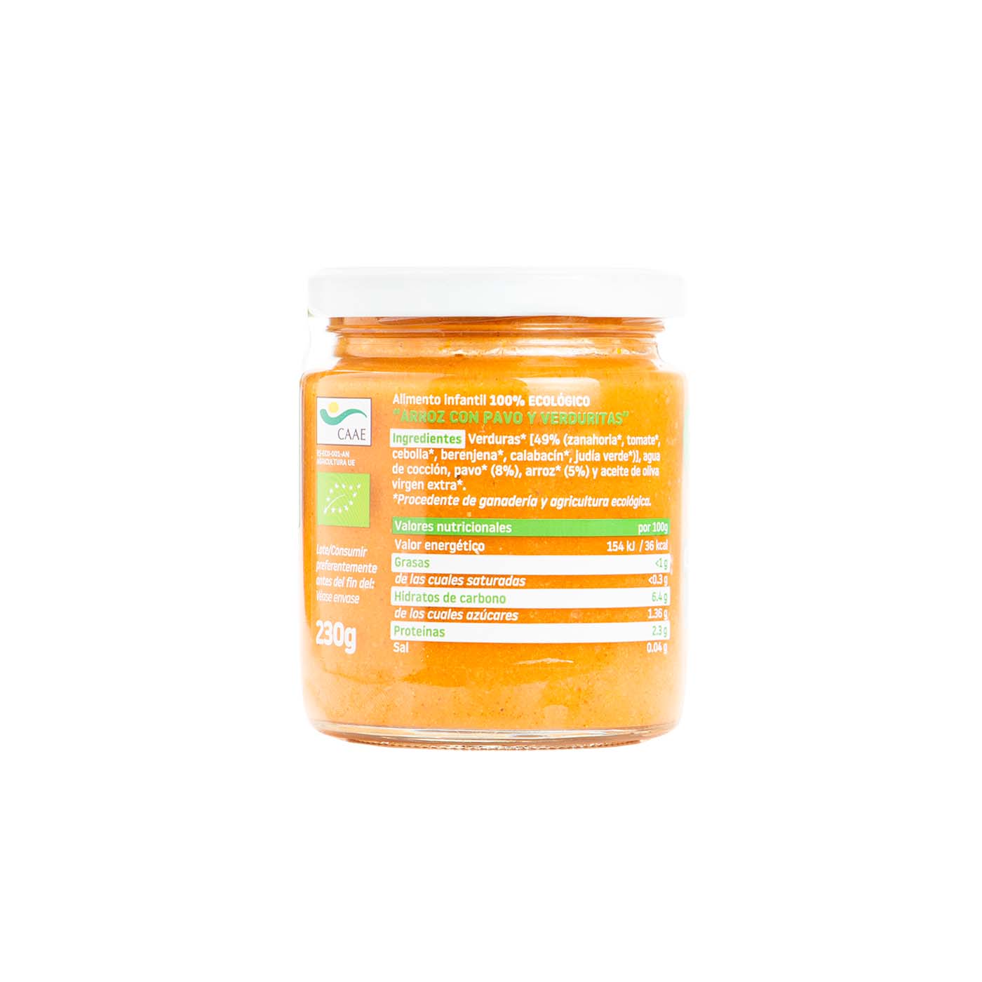 Verduras* [49% (zanahoria*, tomate*, cebolla*, berenjena*, calabacín*, judía verde*)], agua de cocción, pavo* (8%), arroz* (5%) y aceite de oliva virgen extra*. *Procedente de agricultura y ganadería ecológica.