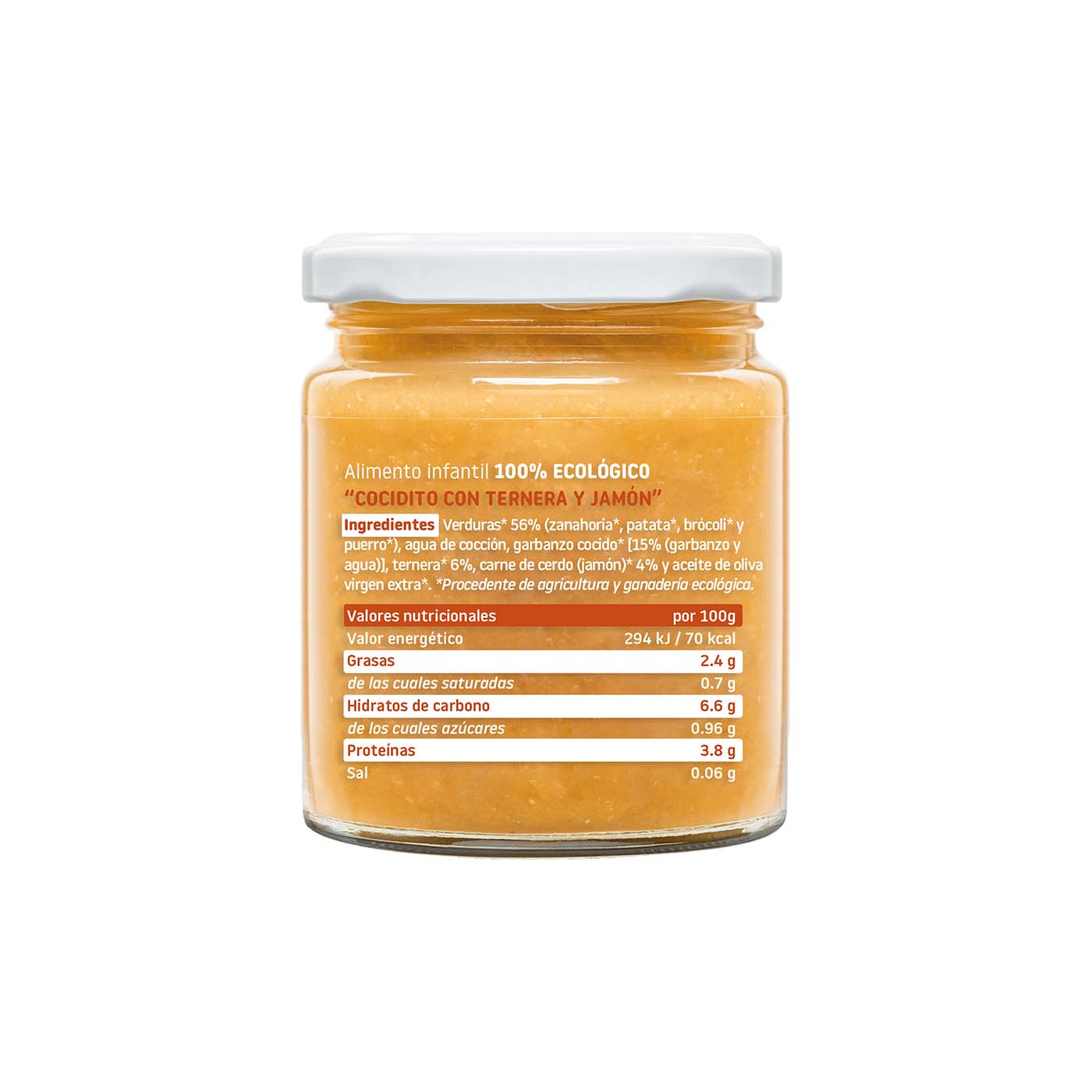 Tarrito de cocido para los más peques elaborado con ingredientes ecológicos y de primera calidad. Lleno de verduras como zanahoria, brócoli y puerro, además de contener carne de ternera y cerdo que harán las delicias de tu peque. Todo ello hecho con aceite de oliva virgen extra. ¡Sin sal añadida!