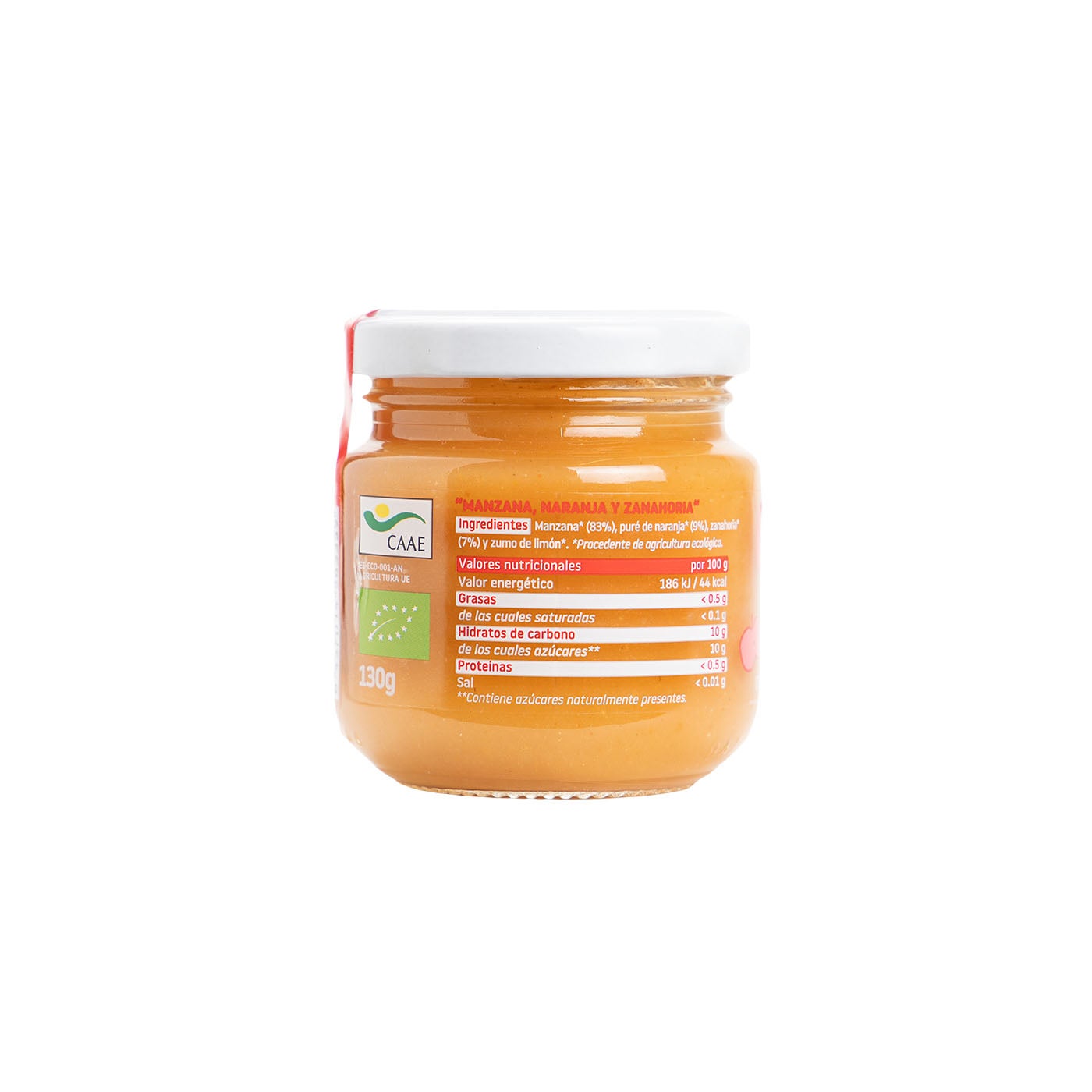 Manzana* (83%), puré de naranja* (9%), zanahoria* (7%) y zumo de limón*. *Procedente de agricultura ecológica.