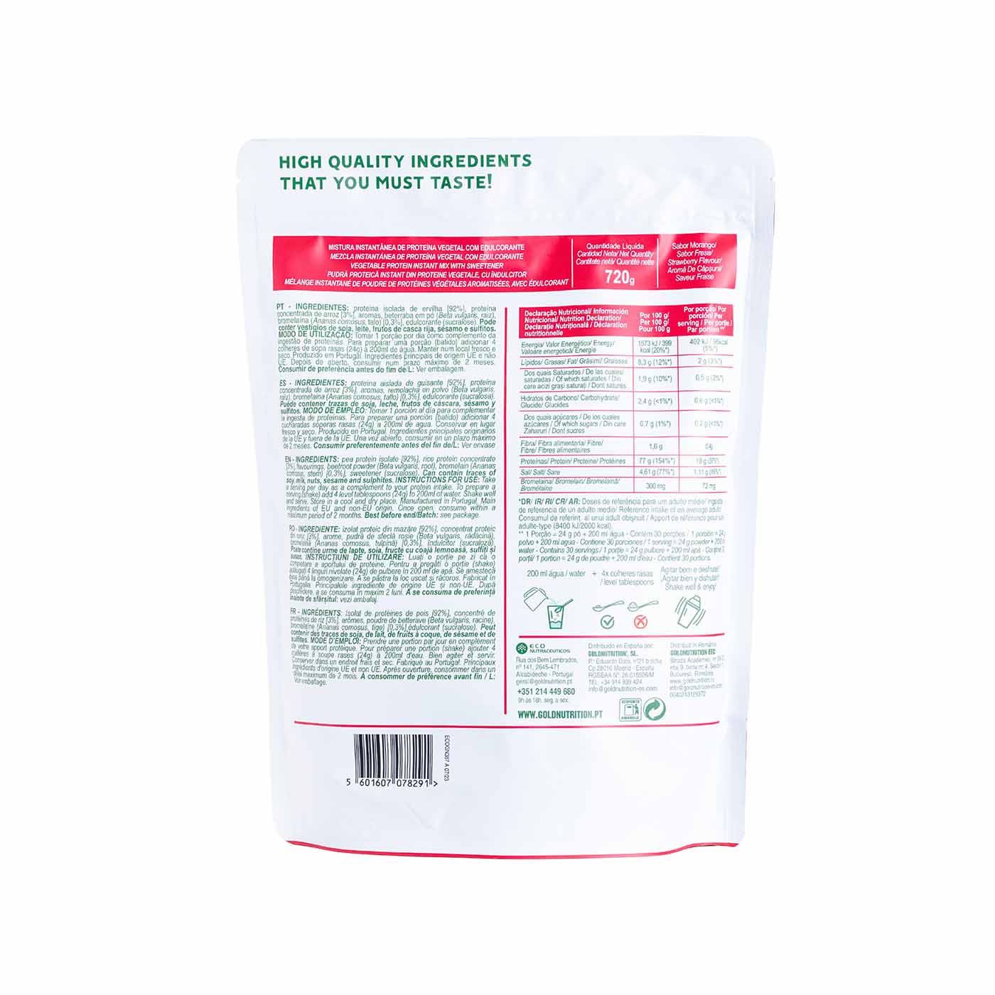 La Proteína Vegana V-Protein sabor Fresa de Gold Nutrition es una opción perfecta para aquellos que buscan una fuente de proteínas vegetales de alta calidad. Compuesta principalmente por proteína de guisante y arroz, esta proteína vegana proporciona todos los aminoácidos esenciales necesarios para el organismo. Con un contenido bajo en azúcares y un delicioso sabor a fresa, es ideal para complementar la ingesta proteica diaria, mantener la masa muscular, y promover la regeneración muscular después del ejercicio. Además, su perfil nutricional la hace adecuada para dietas vegetarianas y veganas, así como para personas preocupadas por el medio ambiente y la sostenibilidad.