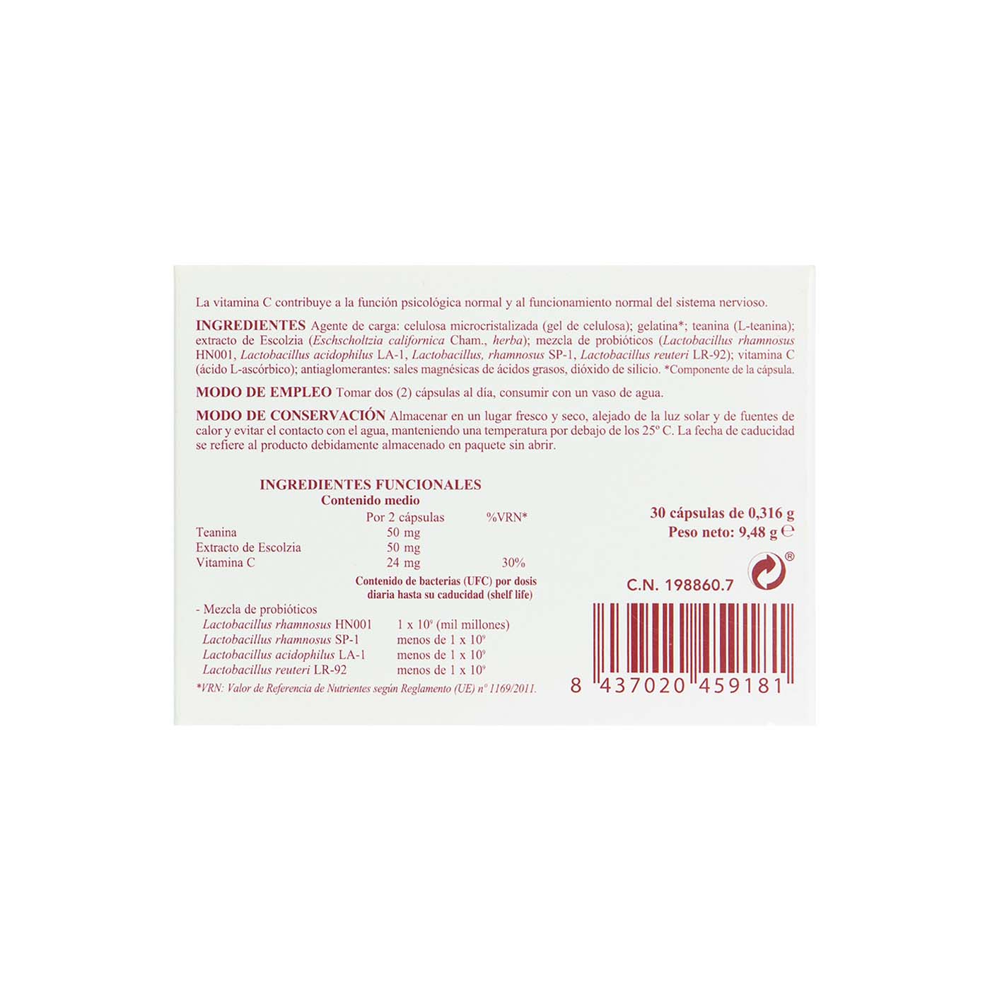 Agente de carga: celulosa microcristalizada (gel de celulosa); gelatina (ingrediente de la cápsula); L-Teanina; extracto de Escolzia (Eschscholtzia californica Cham, herba); Mezcla de fermentos lácteos (Lactobacillus rhamnosus HN001, Lactobacillus acidophilus LA1, Lactobacillus rhamnosus SP1, Lactobacillus reuteri LR92); Vitamina C (Ácido ascorbíco); antiaglomerantes: ácidos grasos, sales de magnesio de los ácidos grasos, dióxido de silicio.