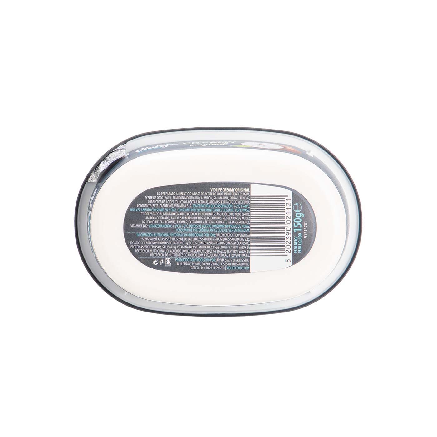 Agua, Aceite de Coco (24%), Almidón Modificado, Almidón, Sal marina, Fibras Cítricas, Corrector de Acidez (Glucono-Delta-Lactona), Aromas, Extracto de Aceituna, Colorante (Beta-Caroteno), Vitamina B12.
