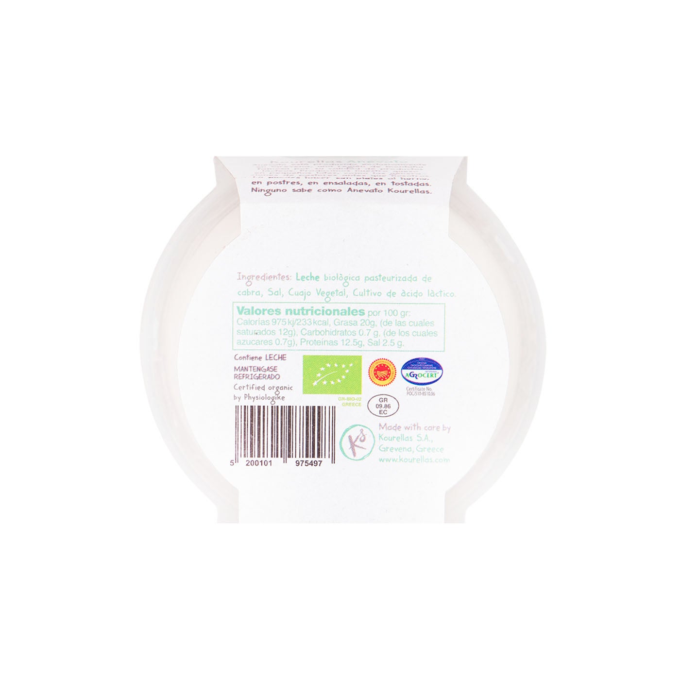 Producto lácteo artesanal de alta calidad, producido por Kourellas, una reconocida empresa griega especializada en productos orgánicos. La producción se lleva a cabo en pequeños lotes, siguiendo métodos tradicionales que han sido transmitidos por generaciones de pastores. Esta práctica artesanal asegura que cada lote mantenga una alta calidad y autenticidad. Hecho con leche de cabra, este queso tiene una textura y sabor únicos.