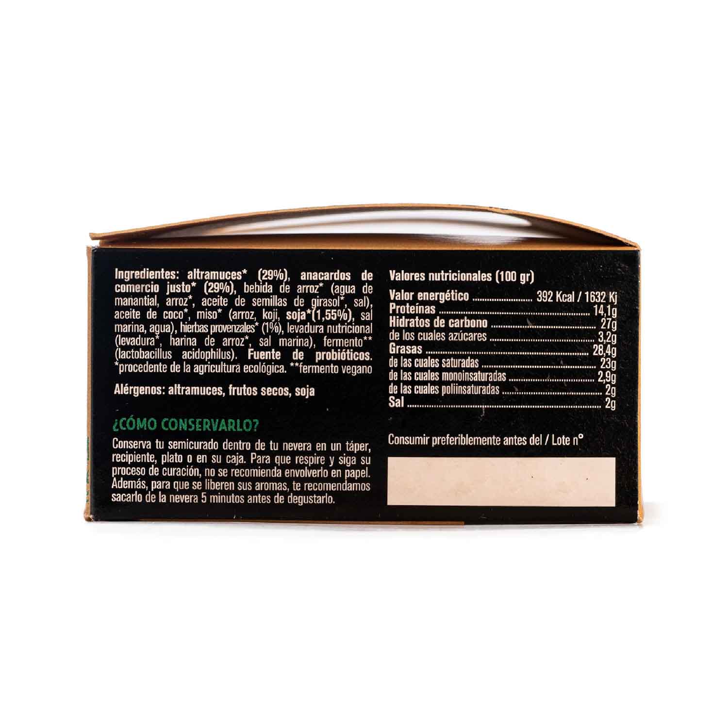 Altramuces* (29%), anacardos* (29%), bebida de arroz* (agua de manantial, arroz italiano*, aceite de semillas de girasol*, sal marina), aceite de coco*, miso* (arroz*, koji, soja*, sal marina, agua), hierbas provenzales* (1%), levadura nutricional* (levadura*, harina de arroz*, sal marina), fermentos acidophilus. Fuente de probióticos. *procedente de la agricultura ecológica