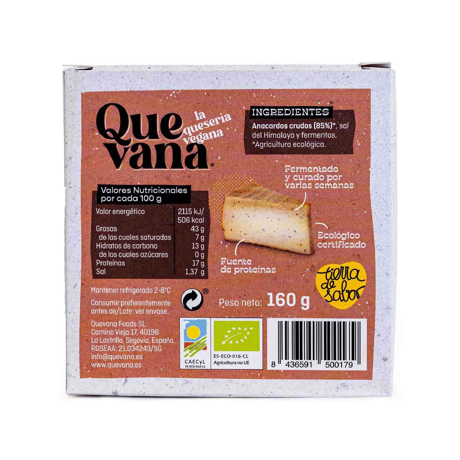 Deliciosamente intenso, completamente ecológico. El Queso Vegano Semicurado Ahumado de Quevana es una experiencia ahumada única, elaborado con una base de 80% de anacardos crudos y un intenso aroma a leña.