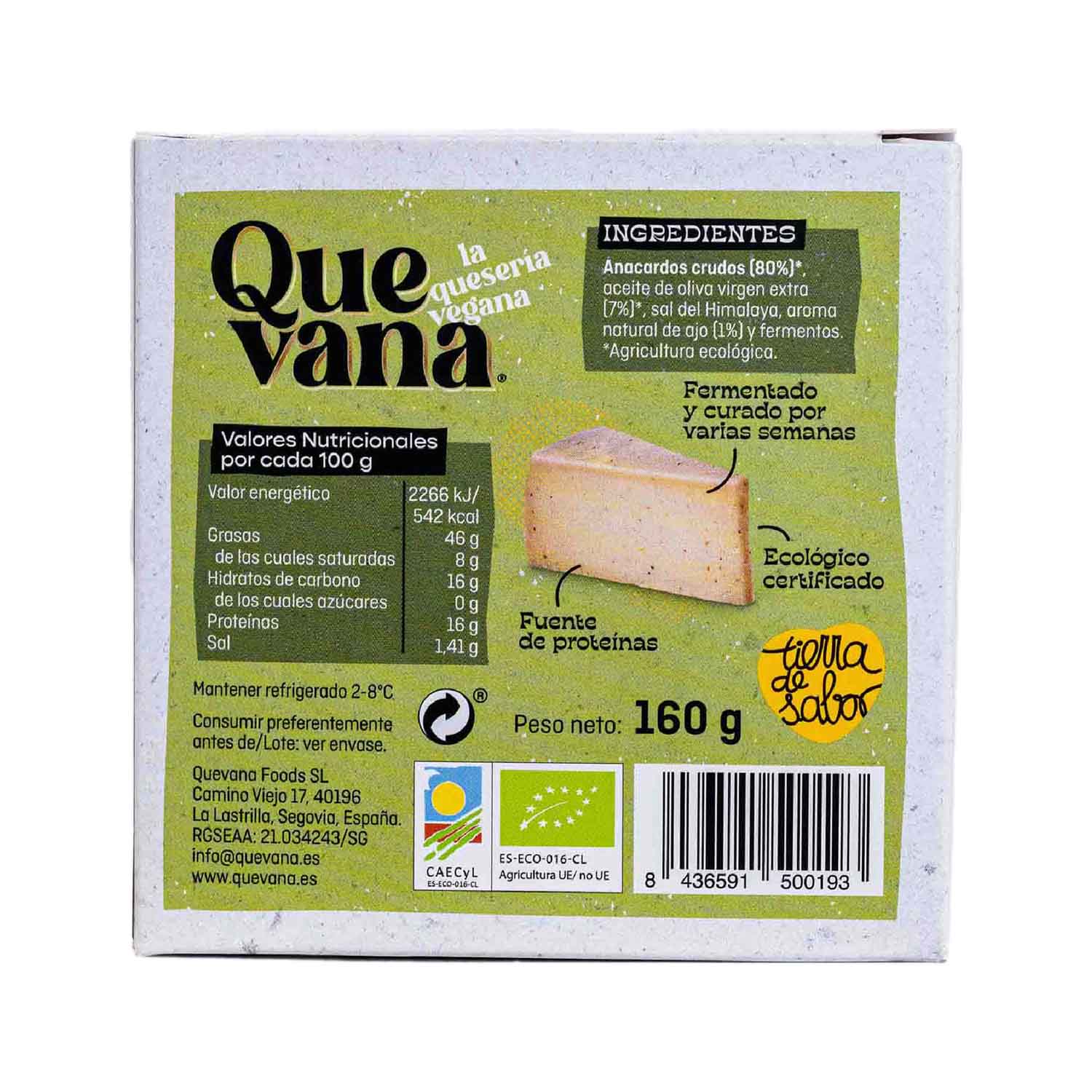 El Queso Vegano Semicurado Ajo-aceite de Quevana es una deliciosa creación elaborada con anacardos, aceite de oliva virgen extra y un toque de ajo, fusionando lo mejor de la cocina mediterránea. Con su proceso de fermentación y maduración, certificado como ecológico, este queso vegano ofrece un sabor suave y exquisito que deleitará tus sentidos.