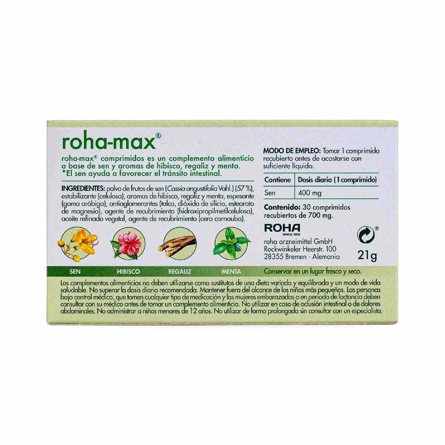 Tránsito intestinal de Roha-Max. Aprovecha los efectos de las hojas de sen (Cassia angustifolia), la Cassia angustifolia ayuda al mantenimiento normal del tránsito intestinal. Roha-Max Tránsito Intestinal es un complemento alimenticio con ingredientes de origen natural. La formulación exclusiva de Roha-max, a base de hojas de sen, hibisco, regaliz y menta que te ayudarán a mantener el tránsito intestinal regular.