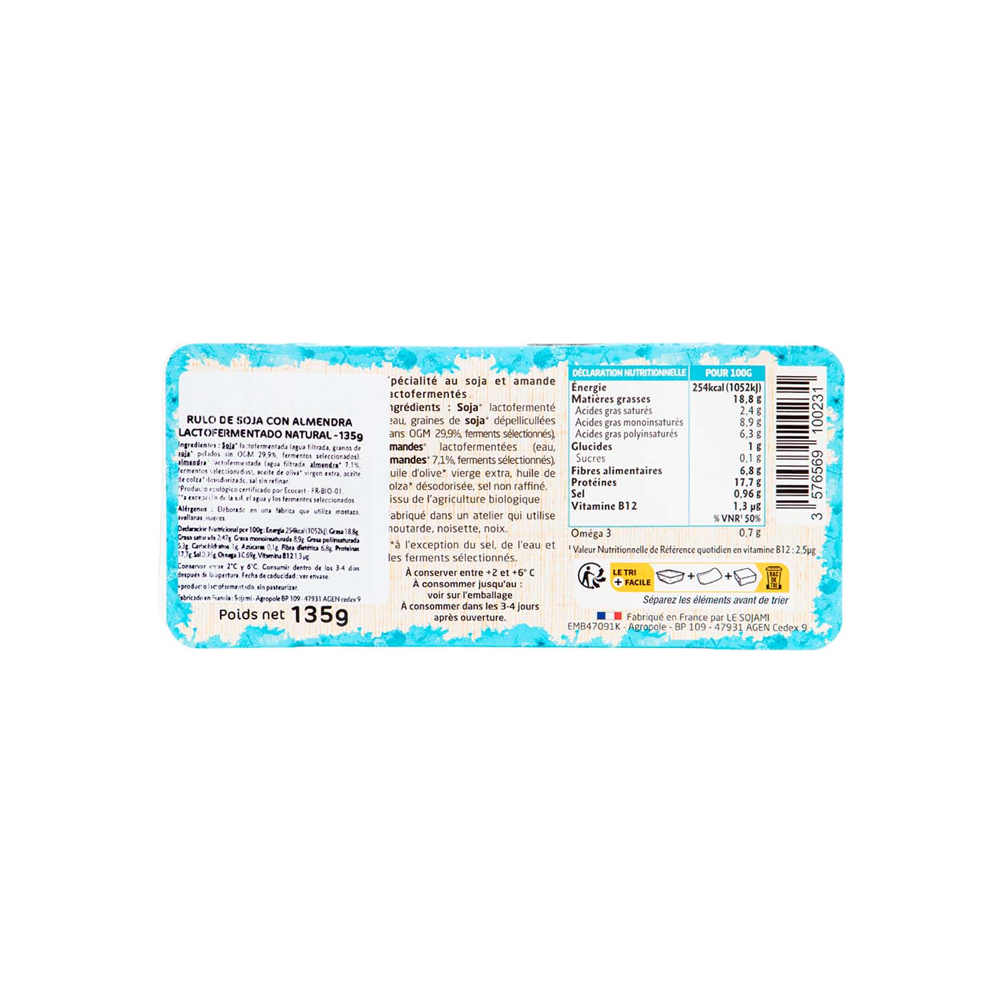 Descubre una textura firme pero cremosa, con un delicado sabor que recuerda al queso. El Rulo de soja y almendra de Sojami es una deliciosa opción vegana para ser disfrutado directamente sobre pan, condimentado o acompañando cualquier receta. Rico en proteínas, fuente de Omega 3, sin gluten, sin lactosa, sin colesterol ni OMG.
