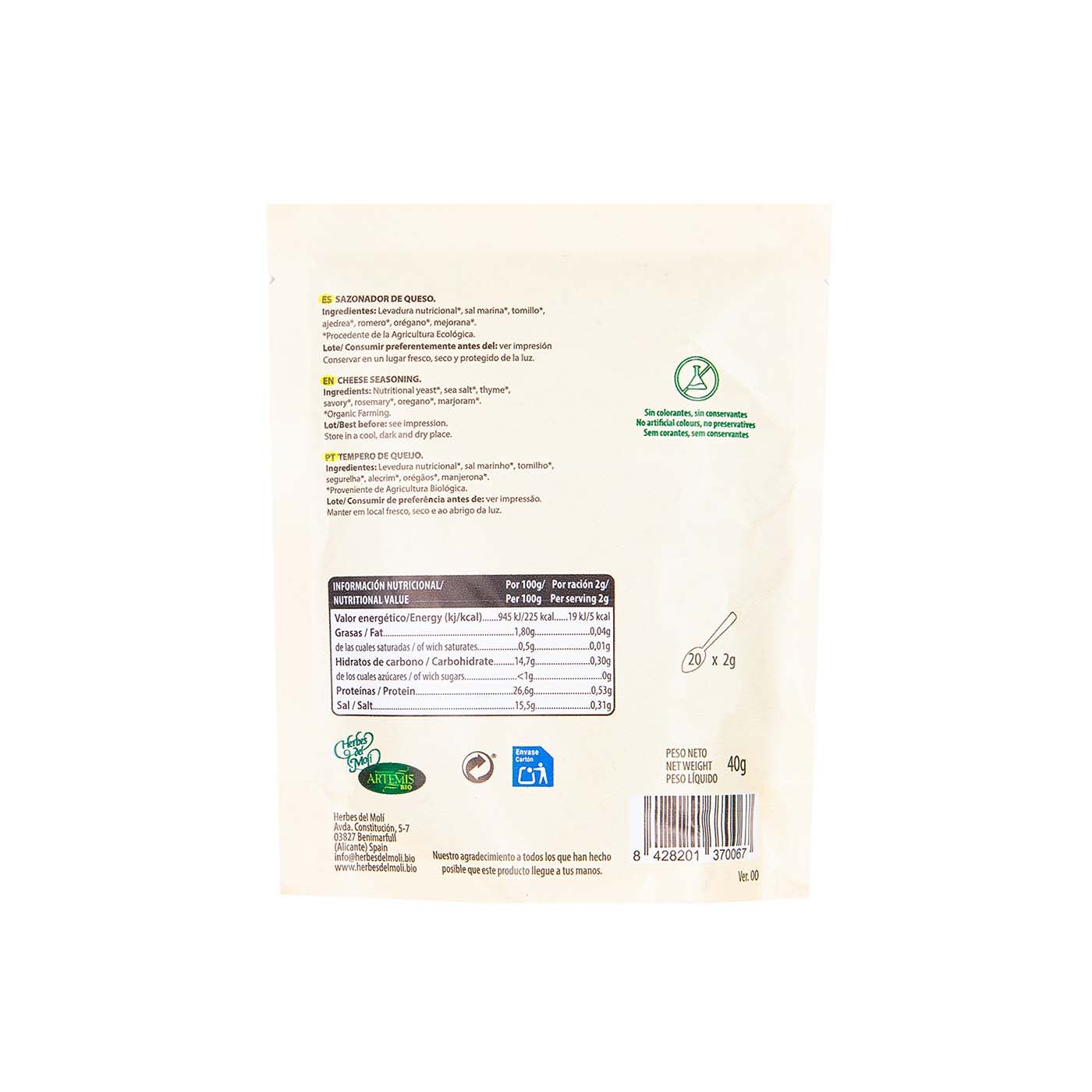 Levadura nutricional bio, sal marina eco, ajedrea (Satureja montana) bio, romero (Rosmarinus officinalis) bio, mejorana (Origanum majorana) bio, orégano (Origanum vulgare) bio, tomillo (Thymus vulgaris) bio.