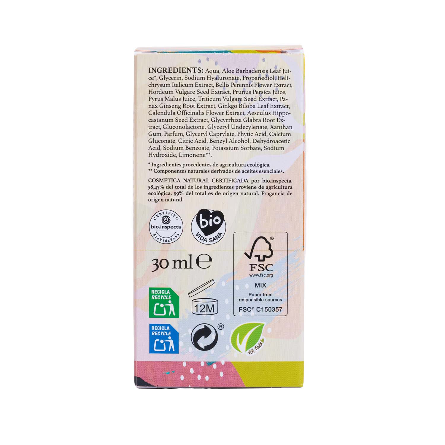 Aqua, Aloe Barbadensis Leaf Juice*, Glycerin, Sodium Hyaluronate, Propanediol, Helichrysum Italicum Extract, Bellis Perennis Flower Extract, Hordeum Vulgare Seed Extract, Prunus Persica Juice, Pyrus Malus Juice, Triticum Vulgare Seed Extract, Panax Ginseng Root Extract, Ginkgo Biloba Leaf Extract, Calendula Officinalis Flower Extract, Aesculus Hippocastanum Seed Extract , Glycyrrhiza Glabra Root Extract, Gluconolactone, Glyceryl Undecylenate, Xanthan Gum, Parfum, Glyceryl Caprylate, Phytic Acid, Calcium Gluconate, Citric Acid, Benzyl Alcohol, Dehydroacetic Acid, Sodium Benzoate, Potassium Sorbate, Sodium Hydroxide, Limonene**.