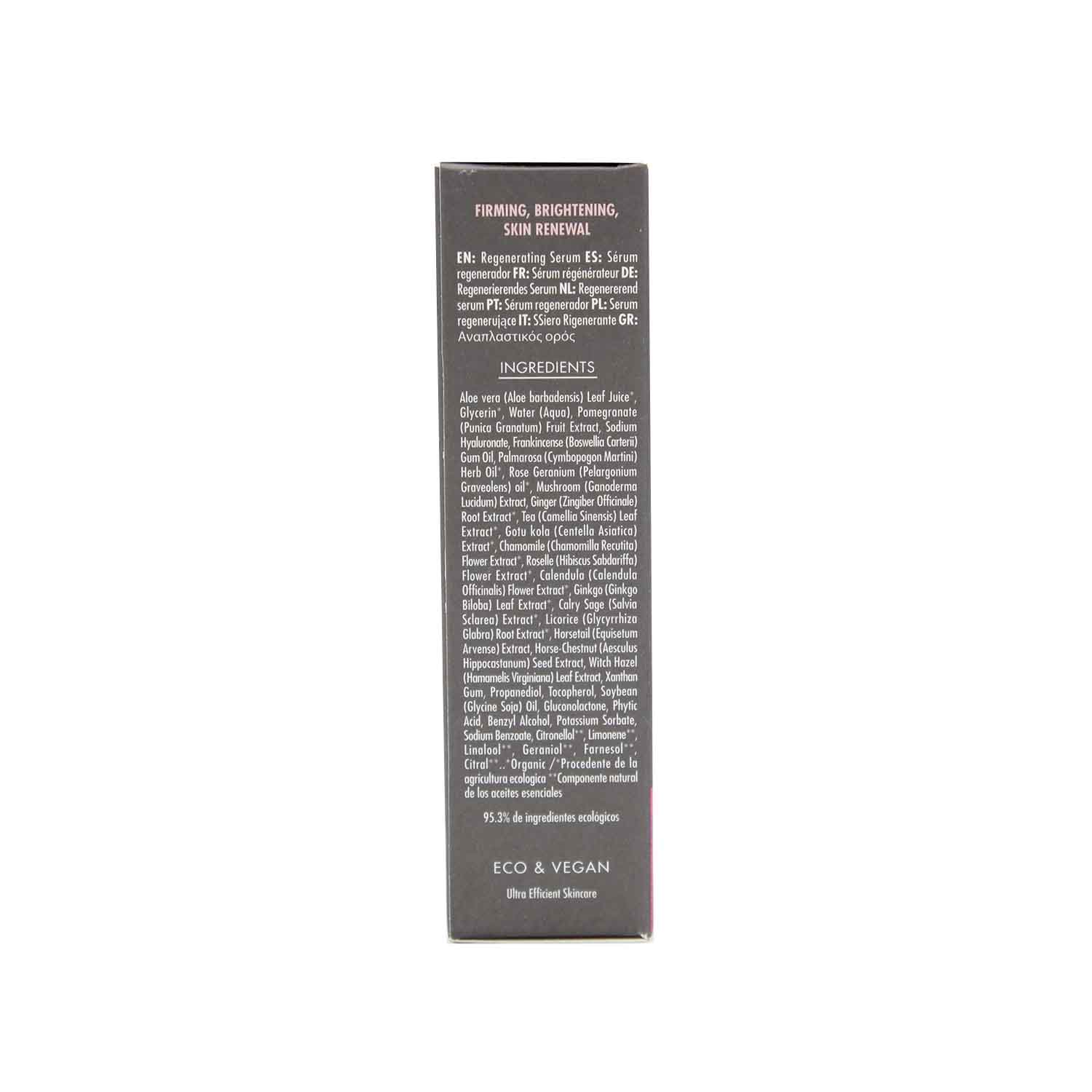 Es un producto que contiene una combinación única de ingredientes naturales con propiedades regeneradoras y reafirmantes. Entre los principales ingredientes encontramos el Reishi, un hongo milenario de origen chino que es conocido por sus propiedades regeneradoras y reafirmantes. También contiene extracto de Granada, que es rico en antioxidantes y ayuda a proteger la piel de los radicales libres, y Jengibre. Además, contiene Ácido Hialurónico, un ingrediente que se encuentra naturalmente en nuestro organismo pero que disminuye con el paso del tiempo. El Ácido Hialurónico ayuda a mantener la piel hidratada y favorece la producción de colágeno, lo que contribuye a mantener la piel firme y elástica.
