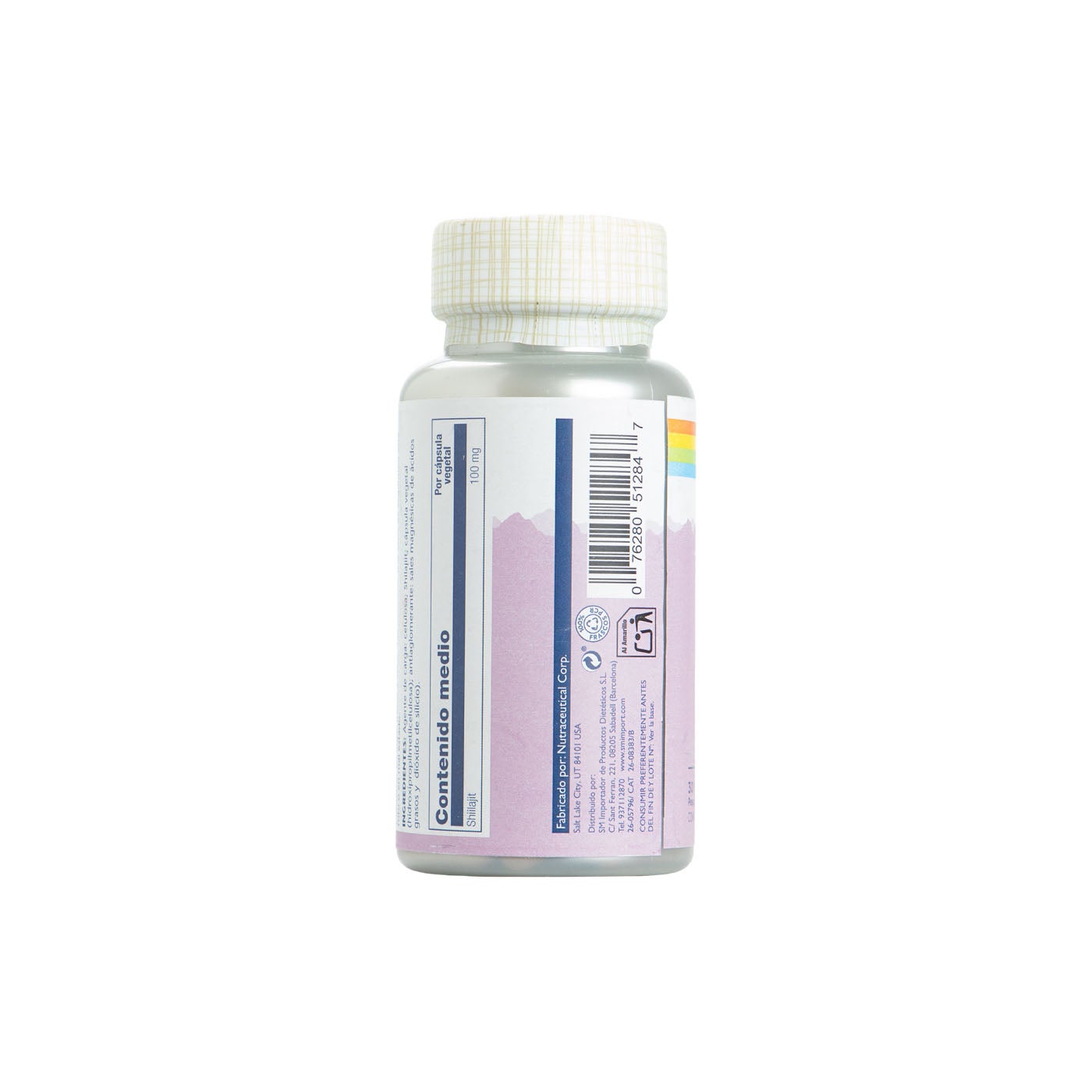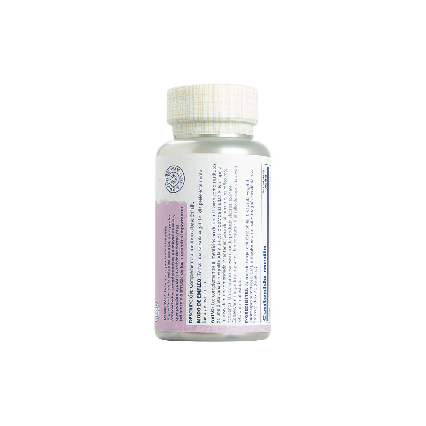 El complemento alimenticio Shilajit de Solaray contiene 100 mg de shilajit purificado por cápsula vegetal. Este shilajit procede de zonas montañosas y ha sido procesado mediante extracción para obtener un polvo apto para su formulación en cápsulas