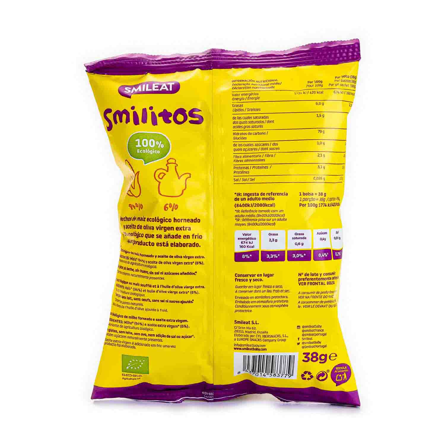 Snack de maíz ecológico con aceite de oliva virgen extra. Estos gusanitos de Smileat están horneados, sin aditivos ni sal añadida.