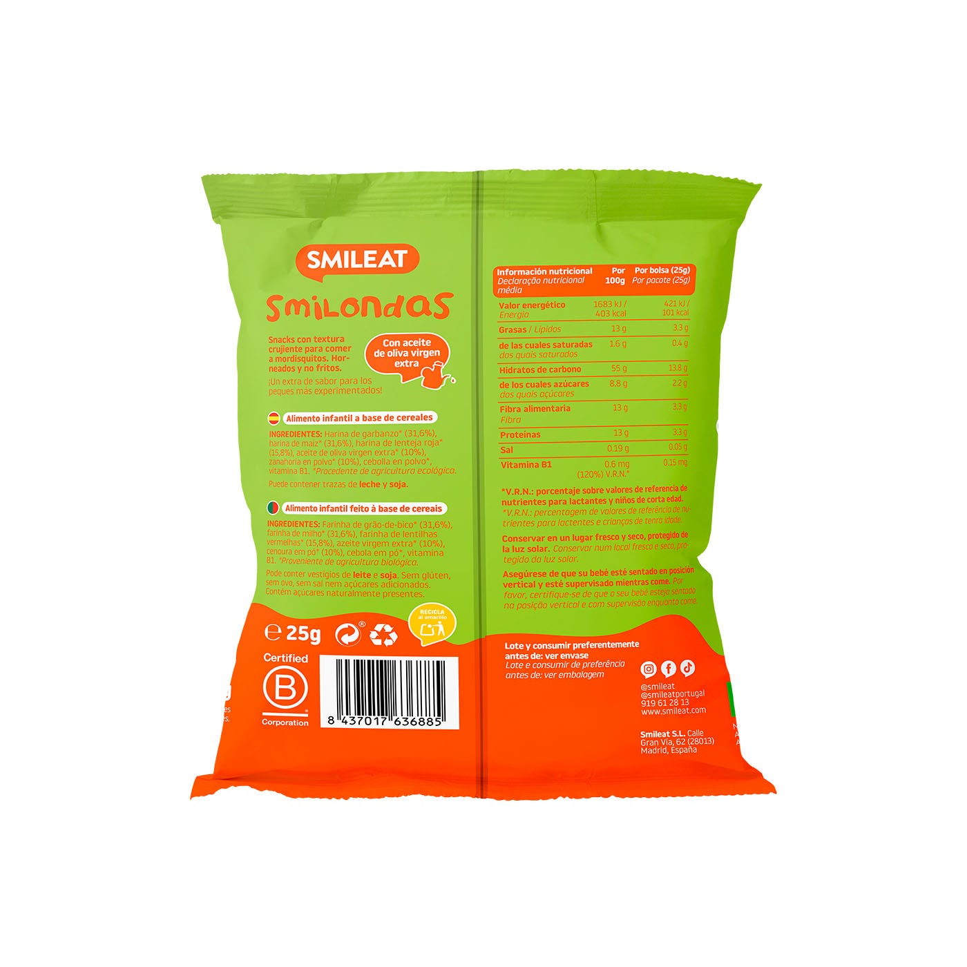 Las Smilondas de Zanahoria de Smileat son un snack orgánico, crujiente y saludable, elaborado con harinas de garbanzo, maíz, lenteja roja, zanahoria y un toque de aceite de oliva virgen extra. Esta combinación de ingredientes ecológicos da como resultado un bocado nutritivo y lleno de sabor, ideal para los más pequeños.