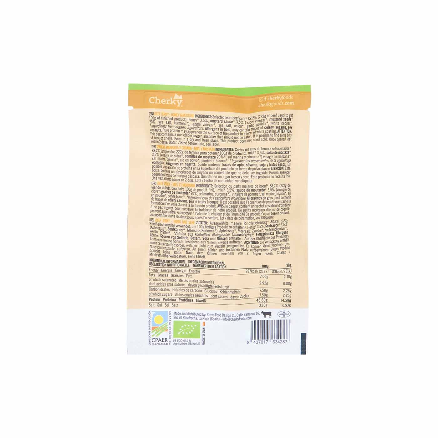 ¡El equilibrio perfecto entre dulce y sabroso! Disfruta de la mejor ternera ecológica con un toque irresistible de miel y mostaza en este snack de ternera de Cherky.
