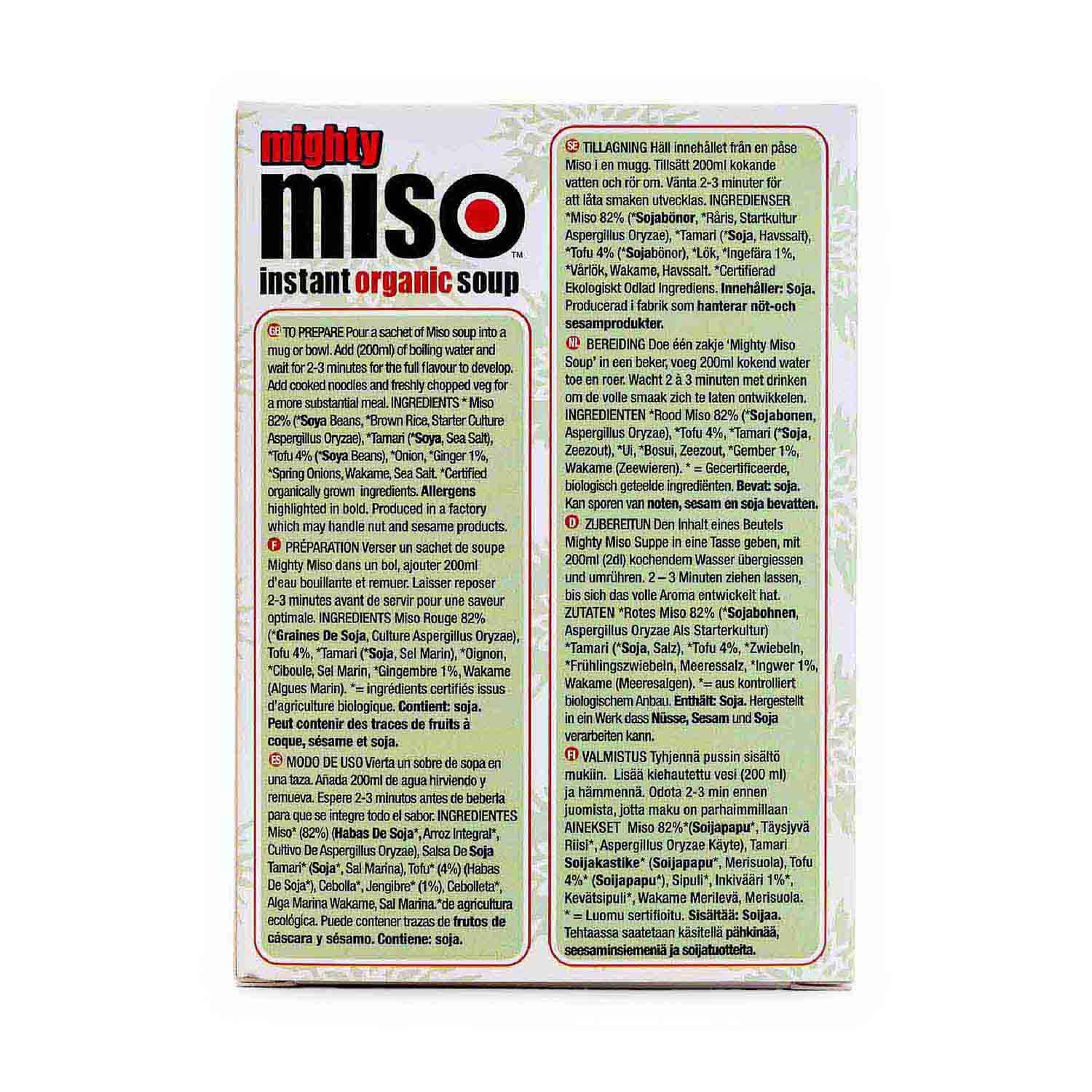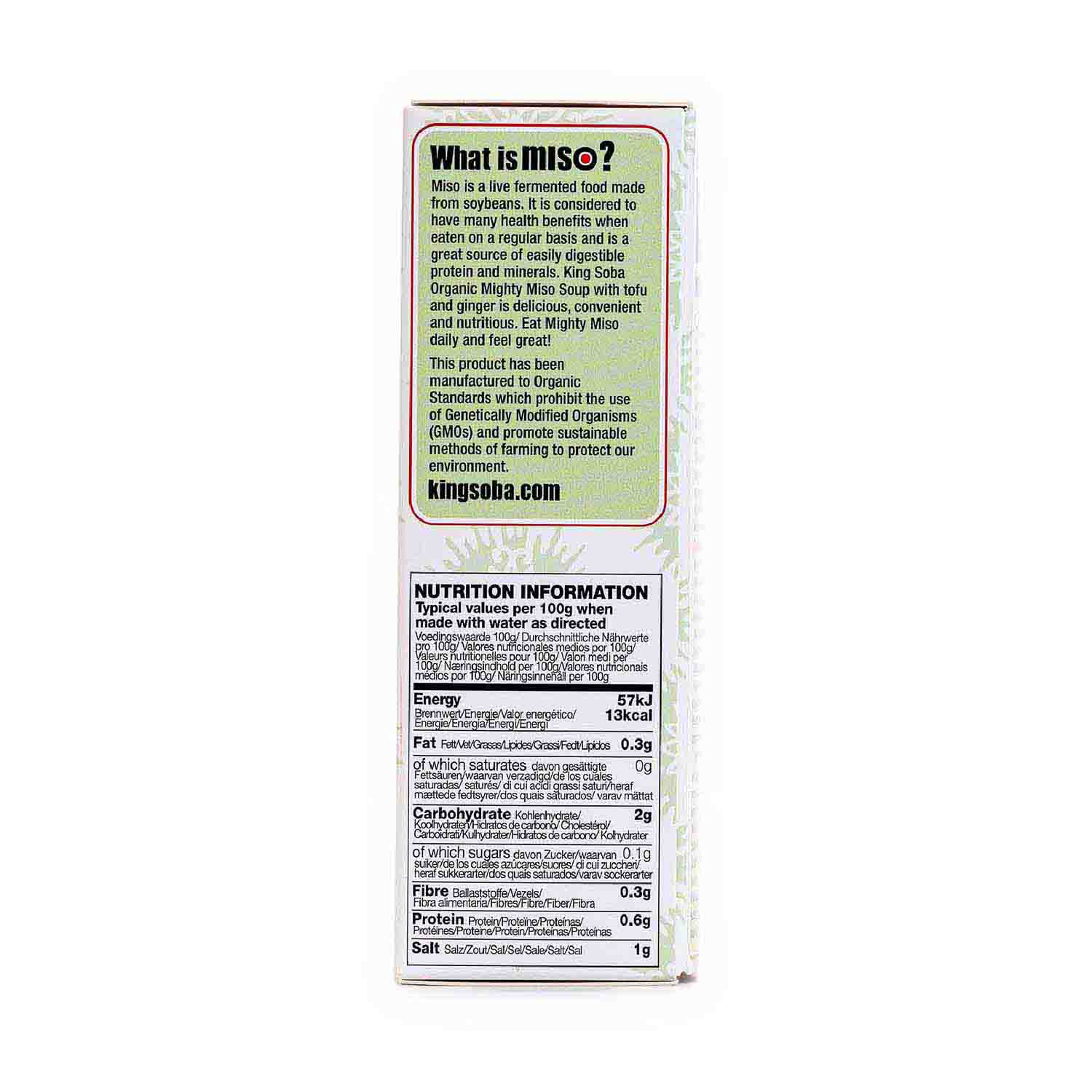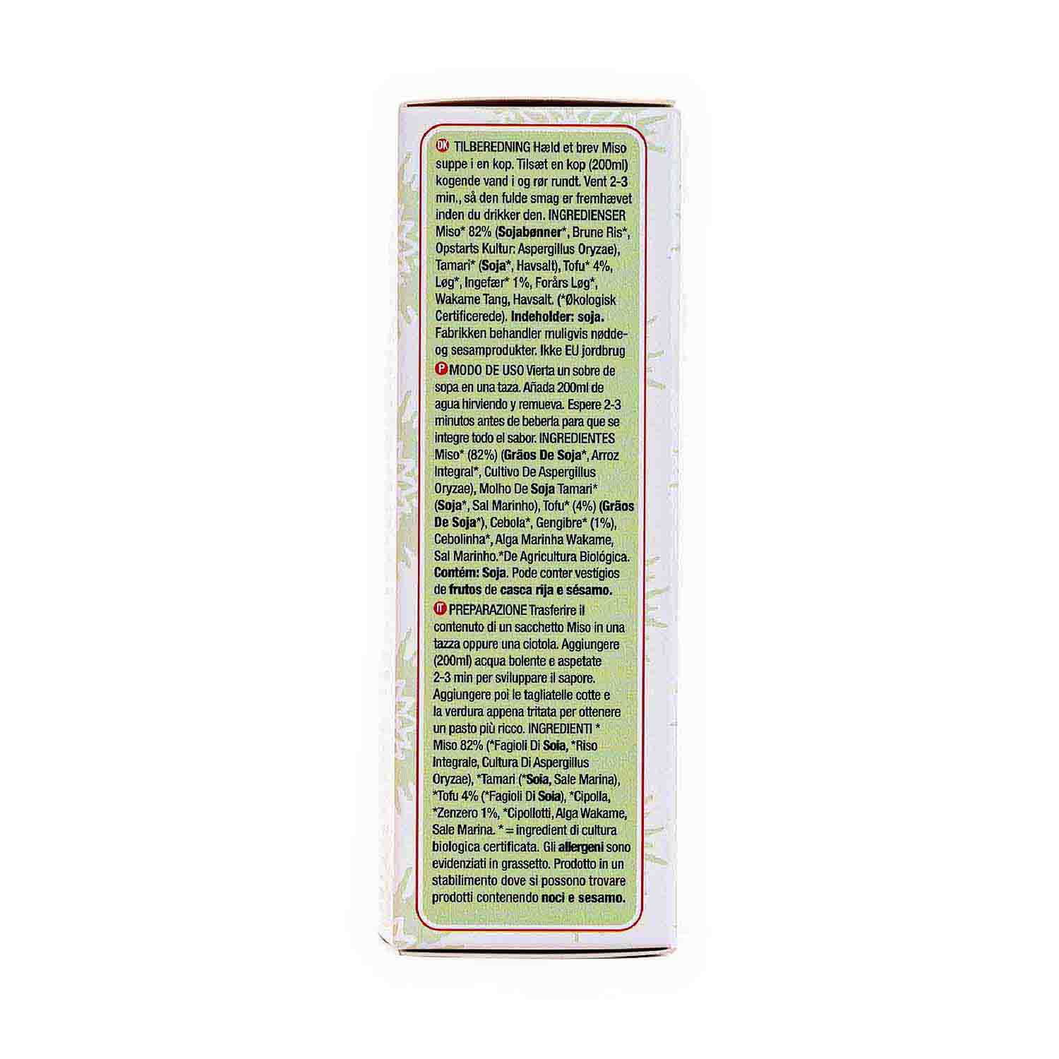 Miso 82% (soja, arroz integral, sal marina, cultivo de aspergillus oryzae), Tamari (soja, sal marina), tofu 4%, cebolla, jengibre 1%, cebolleta y wakame.