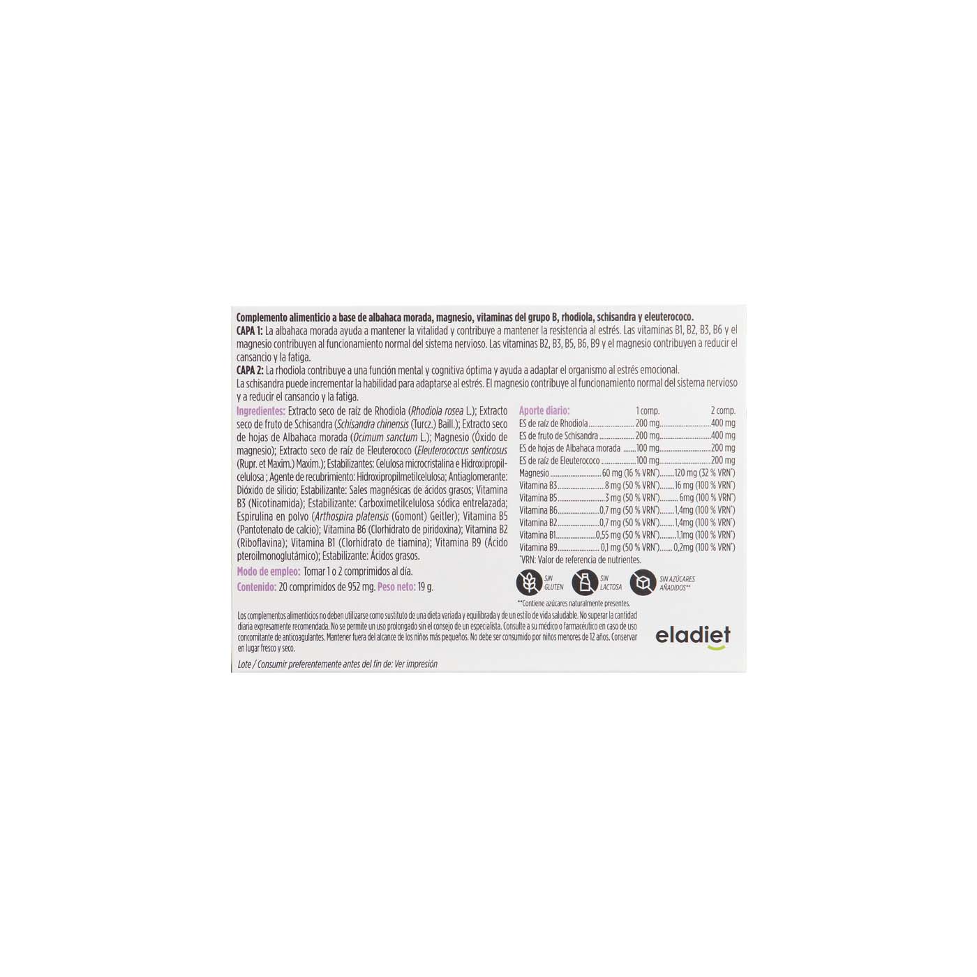 Por 1 comprimido: Extraco seco de hojas de Albahaca morada (100 mg); Extraco seco de raíz de Rhodiola (200 mg); Extraco seco de fruto de Schisandra (200 mg); Extraco seco de raíz de Eleuterococo (100 mg); Magnesio (60 mg, 16 % VRN*); Vitamina B3 (8 mg, 50 % VRN*); Vitamina B5 (3 mg, 50 % VRN*); Vitamina B6 (0,7 mg, 50 % VRN*); Vitamina B2 (0,7 mg, 50 % VRN*); Vitamina B1 (0,55 mg, 50 % VRN*); Vitamina B9 (0,1 mg, 50 % VRN*). Por 2 comprimidos: Extraco seco de hojas de Albahaca morada (200 mg); Extraco seco de raíz de Rhodiola (400 mg); Extraco seco de fruto de Schisandra (400 mg); Extraco seco de raíz de Eleuterococo (200 mg); Magnesio (120 mg, 16 % VRN*); Vitamina B3 (16 mg, 100 % VRN*); Vitamina B5 (6 mg, 100 % VRN*); Vitamina B6 (1,4 mg, 100 % VRN*); Vitamina B2 (1,4 mg, 100 % VRN*); Vitamina B1 (1,1 mg, 100 % VRN*); Vitamina B9 (0,2 mg, 100 % VRN*)