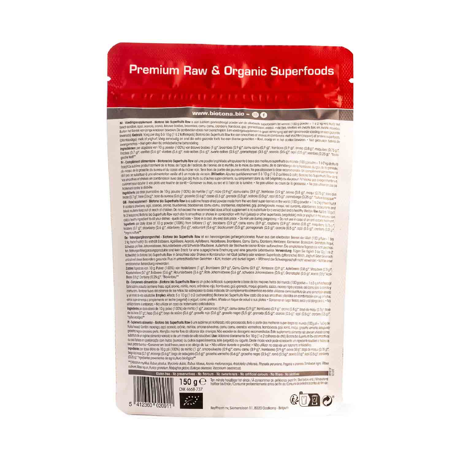 Por dosis diaria de 10 g: polvo (100%) de mirtilo (1 g)*, zarzamora (0,9 g)*, camu camu (0,9 g)*, frambuesa (0,9 g)*, aronia (0,8 g)*, baya de maqui (0,75 g)*, baya de los Incas (0,7 g)*, fresa (0,6 g)*, baya de saúco (0,6 g)*, grosella roja (0,6 g)*, grosella negra (0,5 g)*, granada (0,5 g)*, acerola (0,5 g)*, açaí (0,5 g)*, cranberry (0,25 g)*. *cultivo ecológico