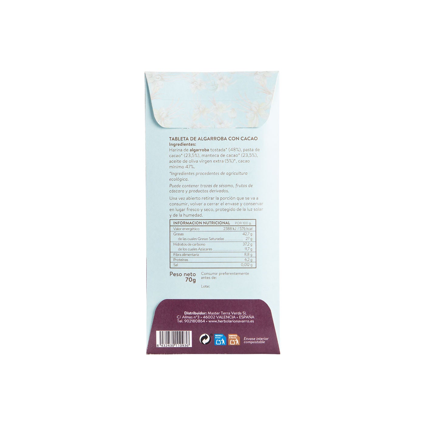 Harina de algarroba tostada*(48%), pasta de cacao*(23,5%), manteca de cacao*(23,5%), aceite de oliva virgen extra*(5%). Cacao 47% mínimo.