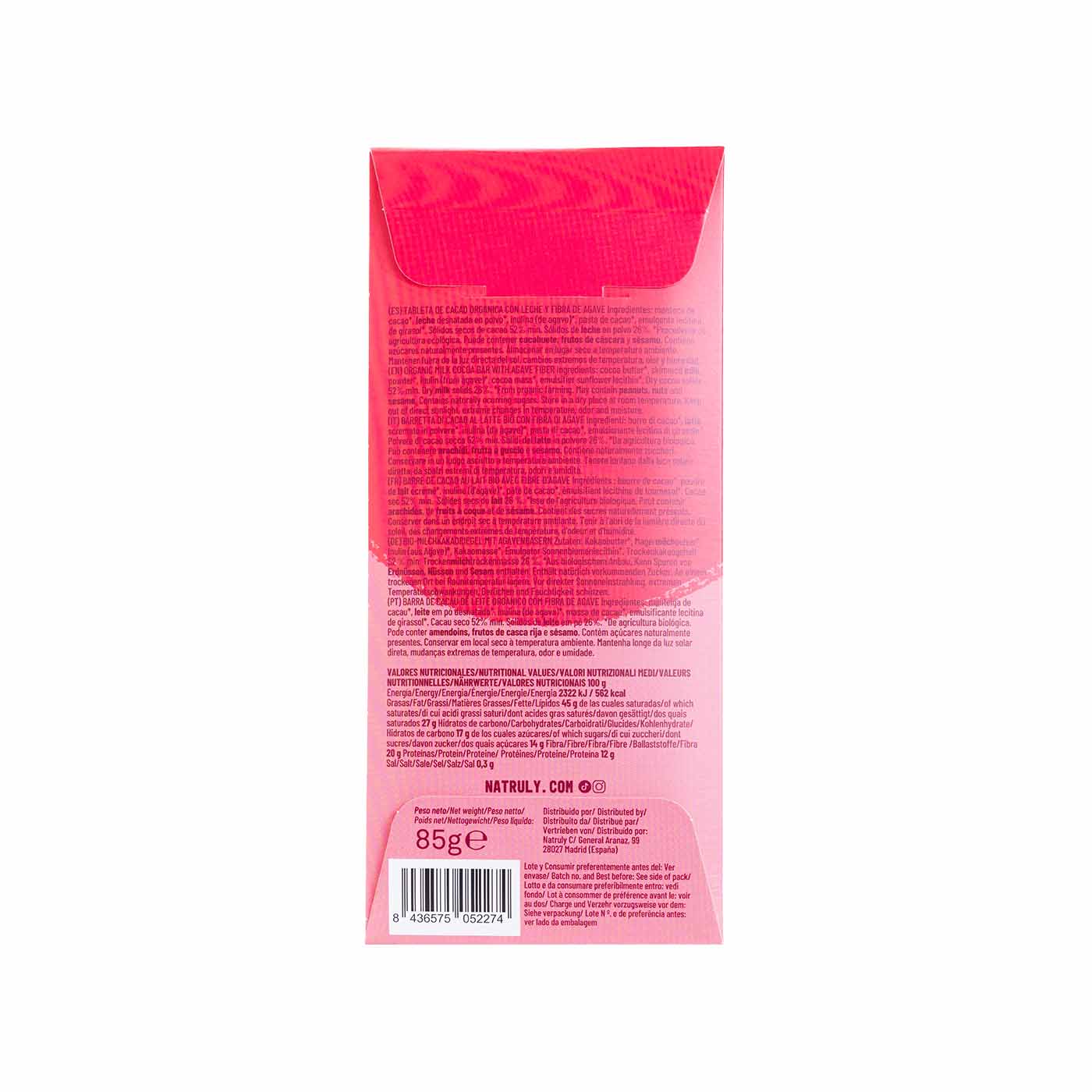 Manteca de cacao*, leche desnatada en polvo*, inulina (de agave)*, masa de cacao*, emulgente lecitina de girasol*. Sólidos secos de cacao 52% mín. Leche en polvo sólida 26%. *Procedente de agricultura ecológica.