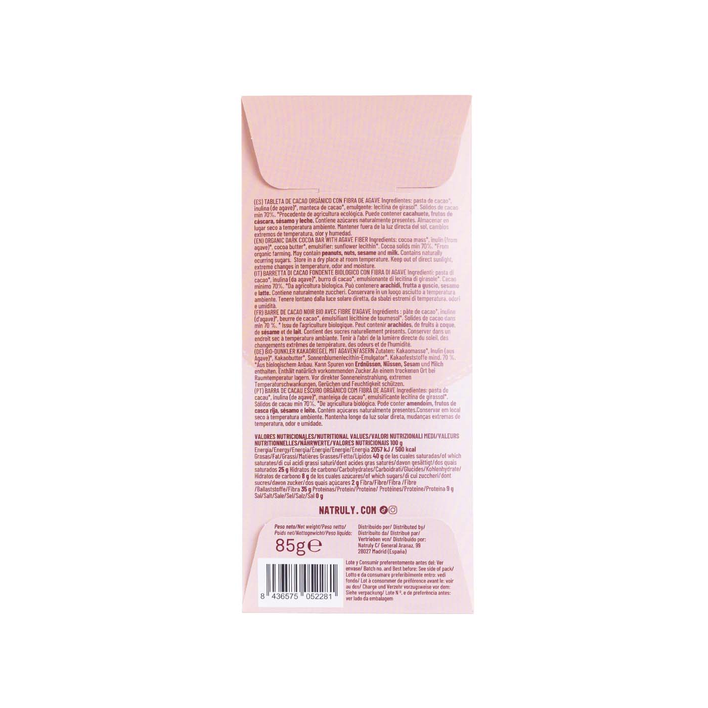 Pasta de cacao*, inulina (de agave)*, manteca de cacao*, emulgente: lecitina de girasol*. Sólidos secos de cacao 70% mín. Leche en polvo sólida 26%. *Procedente de agricultura ecológica.
