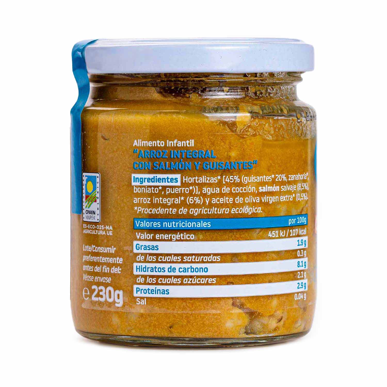 Verduras* 45% (guisantes* 20%, zanahoria*, boniato*, puerro*), agua de cocción, salmón salvaje 8,5%, arroz entero integral* 6%, aceite de oliva virgen extra* 0,5%.
