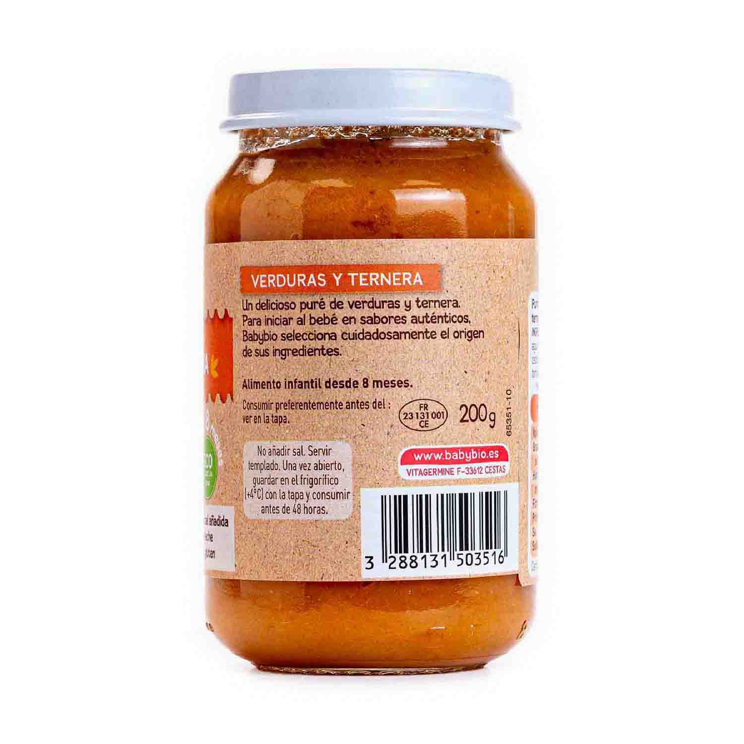 Tarrito menu tradición ternera y verduras de Babybio. Cocción al vapor. Indicados para los bebés a partir de 8 meses. Sin sal añadida. Sin espesantes. Sin gluten. Sin proteínas de leche.