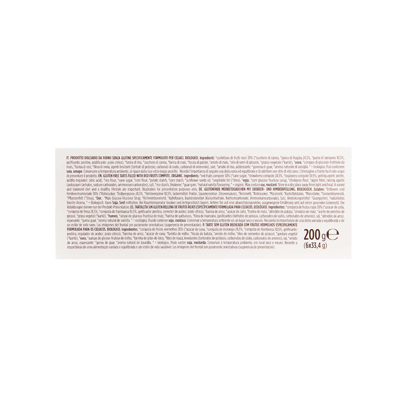Compota de frutos rojos 30% (azúcar de caña, compota de fresa 24,5%, compota de frambuesa 10,5%, gelificante: pectina, corrector de acidez: ácido citrico), harina de arroz, azúcar de caña, harina de maiz, almidón de patata, almidón de maiz, aceite de semillas de girasol, aceite de karité, huevos, sirope de glucosa-fructosa de maiz, harina de garbanzos, fibra de manzana, gasificantes (tartratos de potasio, carbonatos de sodio, carbonatos de amonio), sal, almidón de arroz, espesante: goma guar, aroma natural de vainilla. *procedente de cultivo ecológico.