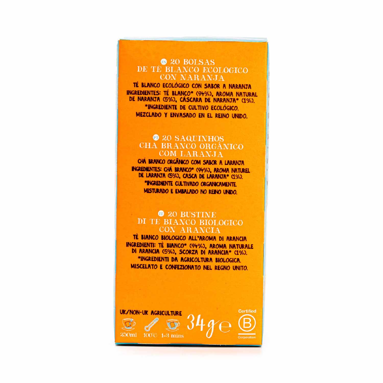 Te blanco*(94%), aroma natural de naranja (5%), cáscara de naranja*(1%). * Ingrediente de cultivo ecológico.