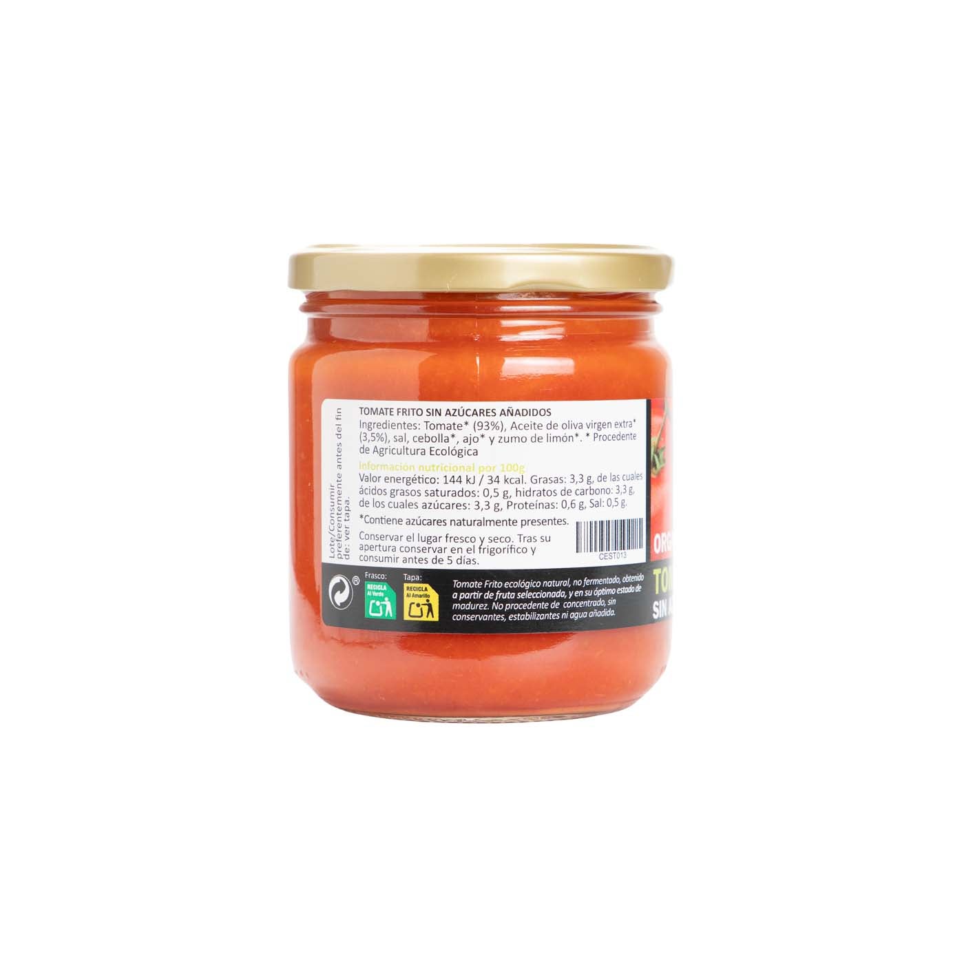 El Tomate Frito sin azucares añadidos Bio de Bio Cesta es una deliciosa salsa elaborada con tomates ecológicos frescos (93%), aceite de oliva virgen extra (3,5%), sal, cebolla, ajo y zumo de limón. Este tomate frito ecológico se obtiene a partir de frutas seleccionadas en su óptimo estado de madurez, sin fermentar y sin utilizar concentrados. Además, no contiene conservantes, estabilizantes ni agua añadida, garantizando así un producto natural y de alta calidad.