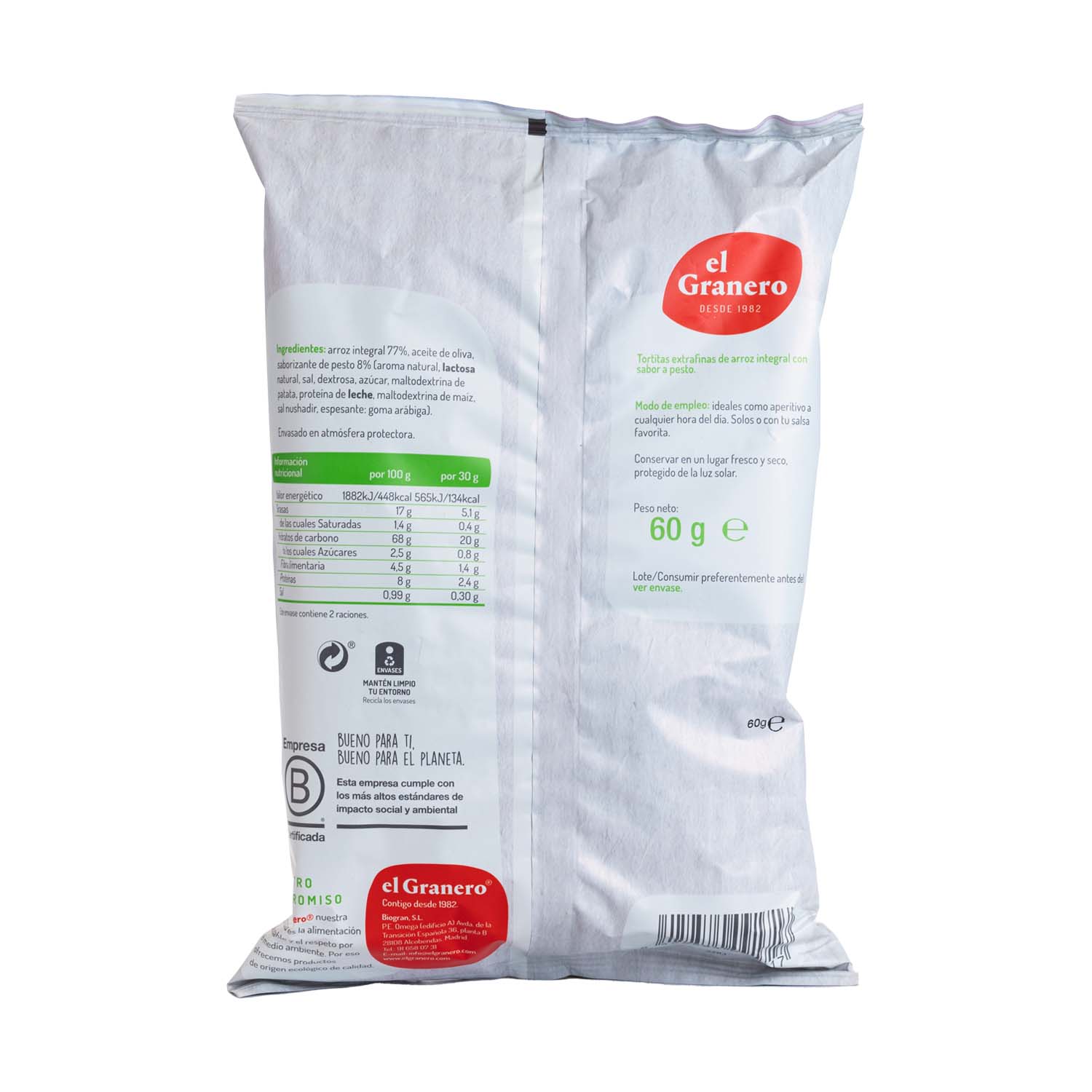 Arroz integral 77%, aceite de oliva, saborizante de pesto 8% (aromas naturale, lactosa natural, sal, dextrosa, azúcar, maltodextrina de patata, proteína de leche, maltodextrina de maíz, sal de nushadir, espesante: goma arábiga. Envasado en atmósfera protectora