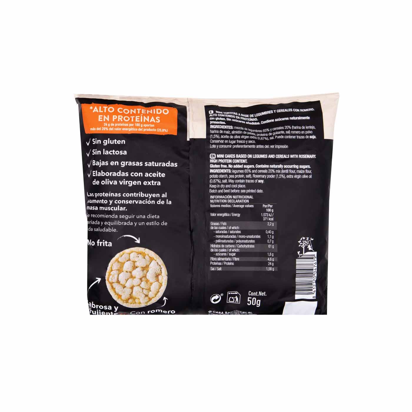 Estas deliciosas tortitas están elaboradas con una mezcla de legumbres y cereales, y son ideales para quienes buscan un snack saludable, rico en proteínas y sin gluten. Con un 24% de proteína por cada 100g, aportan más del 20% del valor energético del producto (25.8%), lo que las convierte en una excelente opción para un aporte proteico extra en tu dieta.