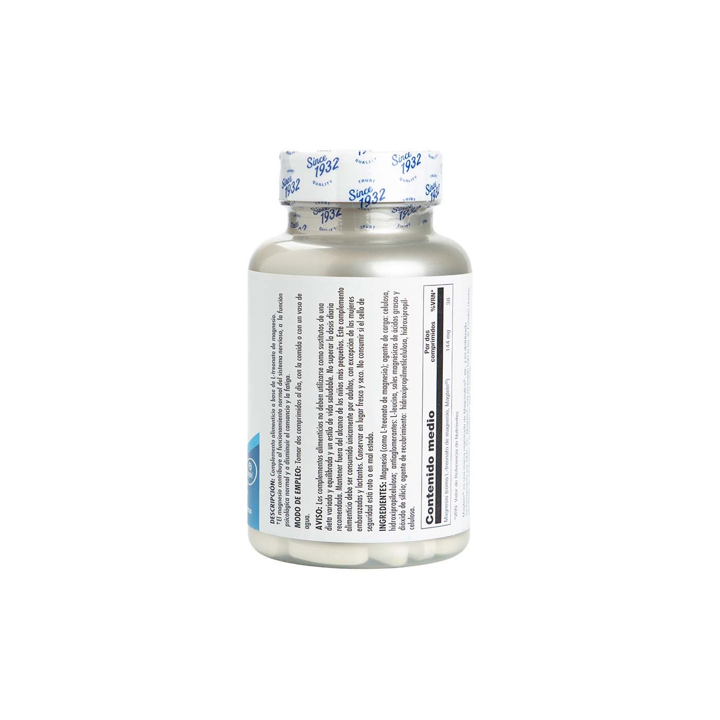 Contenido medio (por 2 comprimidos): Magnesio (como L-treonato 38% de magnesio, Magtein®) 144mg 38%VRN*