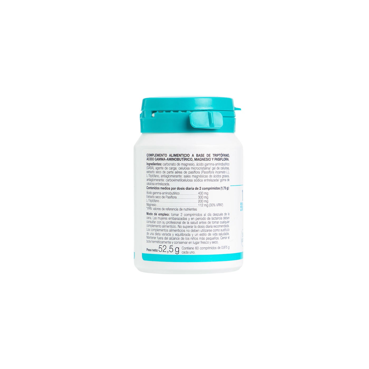 Contenidos medios por dosis diaria de 2 comprimidos (1,75 g): ácido gamma-aminobutírico 400mg; extracto seco de Pasiflora 300 mg; L-Triptófano 200mg; Magnesio 112 mg (30% VRN*).