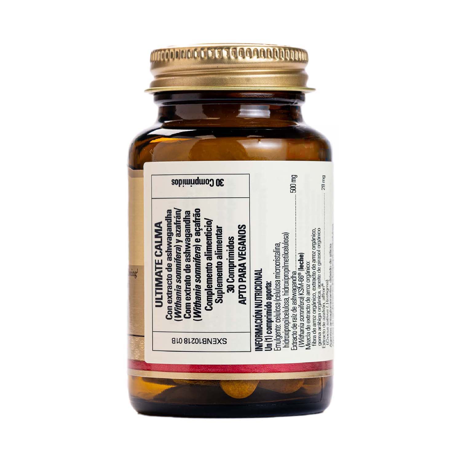 Ultimate calm de Solgar. Formulado para relajarse y para el bienestar mental. Aporta una ayuda en los momentos en los que tenemos más estrés o cuando nos sentimos sobrecargados. Contiene dos ingredientes botánicos patentados, científicamente estudiados: ashwagandha (KSM-66®) y azafrán (affron®), que contribuye a mantener un estado de ánimo positivo y al equilibrio emocional. La ashwagandha es una planta que tiene propiedades adaptogénicas y contribuye a mantener un estado de ánimo tranquilo y relajado. Por otro lado, el azafrán contribuye al balance emocional y ayuda a mantener un estado de ánimo positivo, aporta un efecto relajante, contribuye a disminuir la inquietud y ayuda a disminuir la irritabilidad.