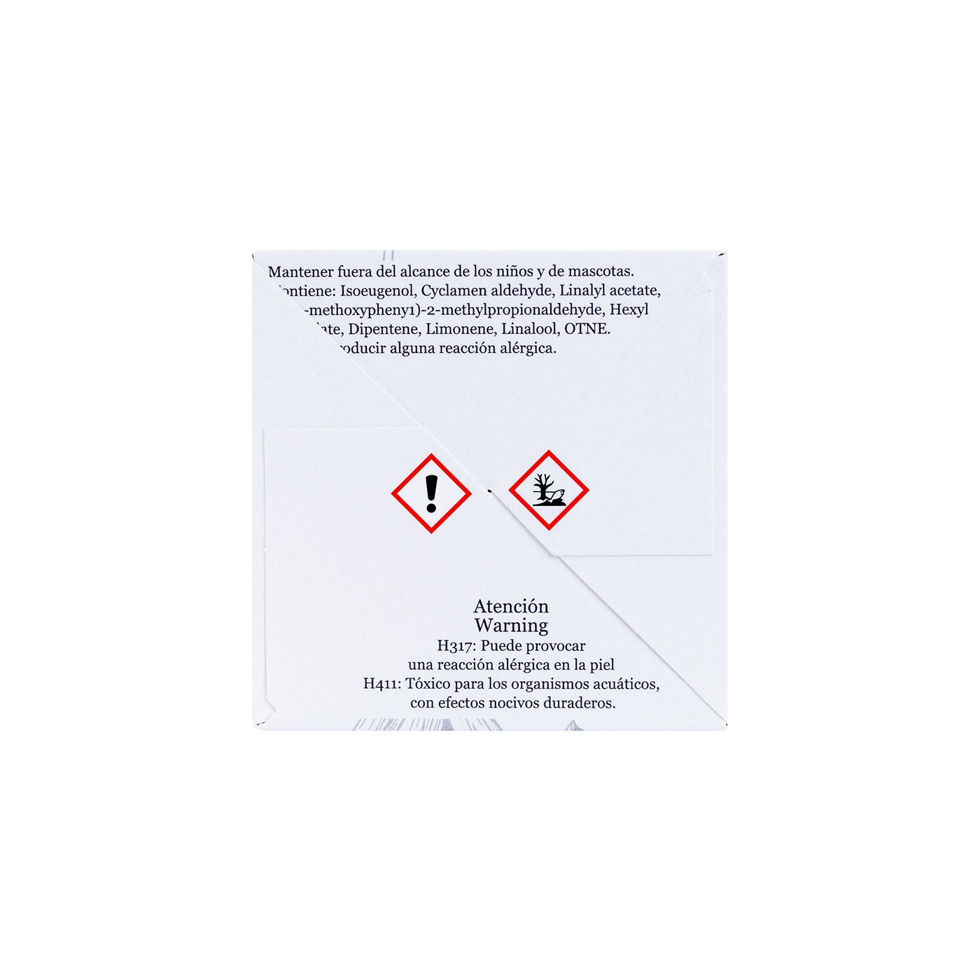 Mantener fuera del alcance de los niños y de mascotas. Contiene: Isoeugenol, Cyclamen aldehyde, Linalyl acetate, 3-(p-methoxypheny1)-2-methylpropionaldehyde, Hexyl salicylate, Dipentene, Limonene, Linalool, OTNE. Puede producir alguna reacción alérgica.