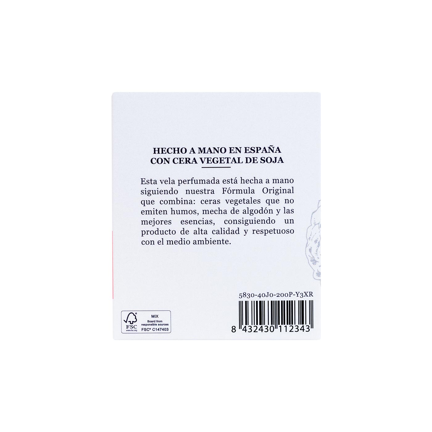 Esta vela perfumada está hecha a mano siguiendo una fórmula original que combina ceras vegetales que no emiten humos, mecha de algodón y las mejores esencias, consiguiendo un producto de alta calidad y respetuoso con el medio ambiente.
