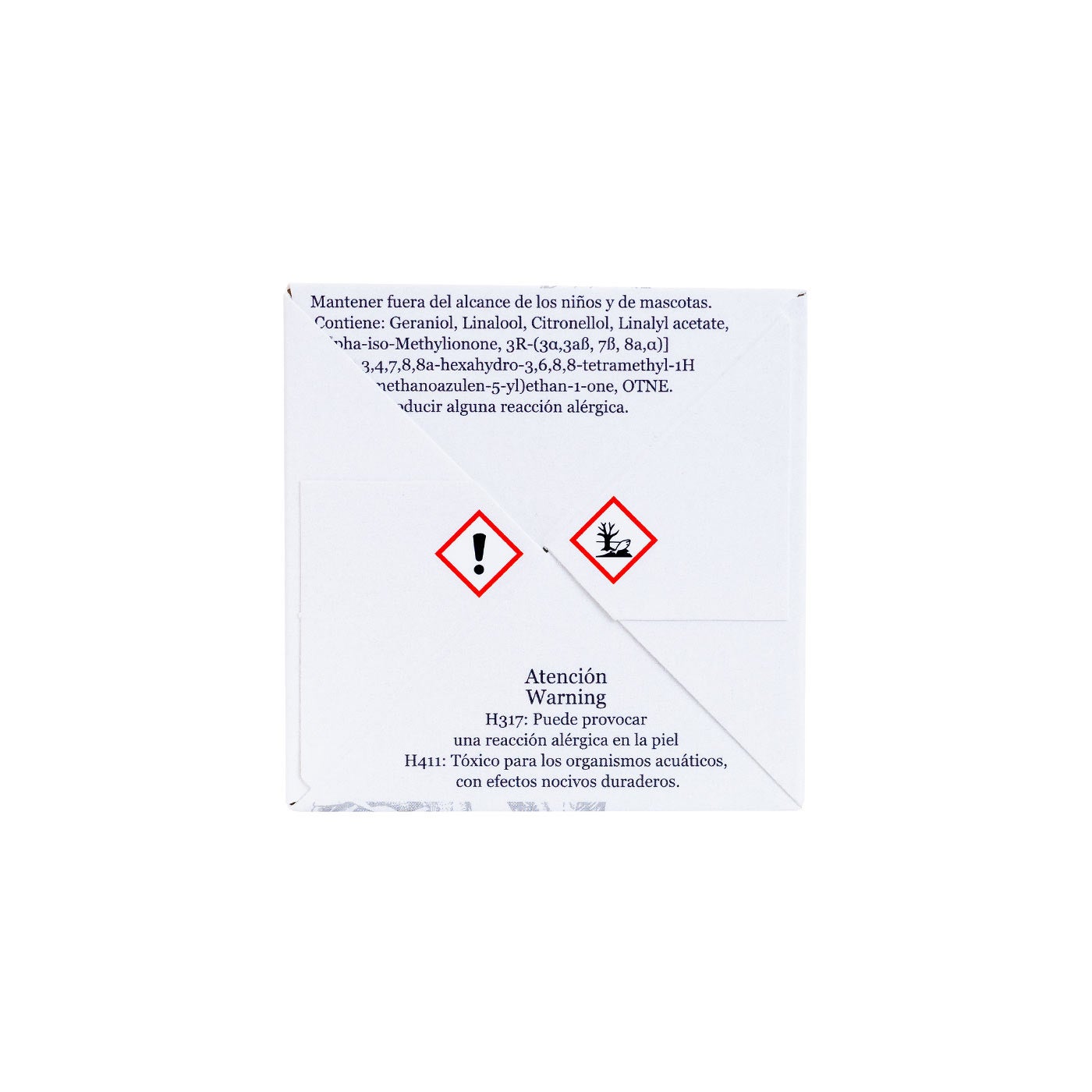Mantener fuera del alcance de los niños y de mascotas. Contiene: Geraniol, Linalool, Citronellol, Linalyl acetate, Alpha-iso-Methylionone, 3R-(3α,3aß, 7ß, 8a,α)] -1-(2,3,4,7,8,8a-hexahydro-3,6,8,8-tetramethyl-1H -3a, 7-methanoazulen-5-yl)ethan-1-one, OTNE. Puede producir alguna reacción alérgica.
