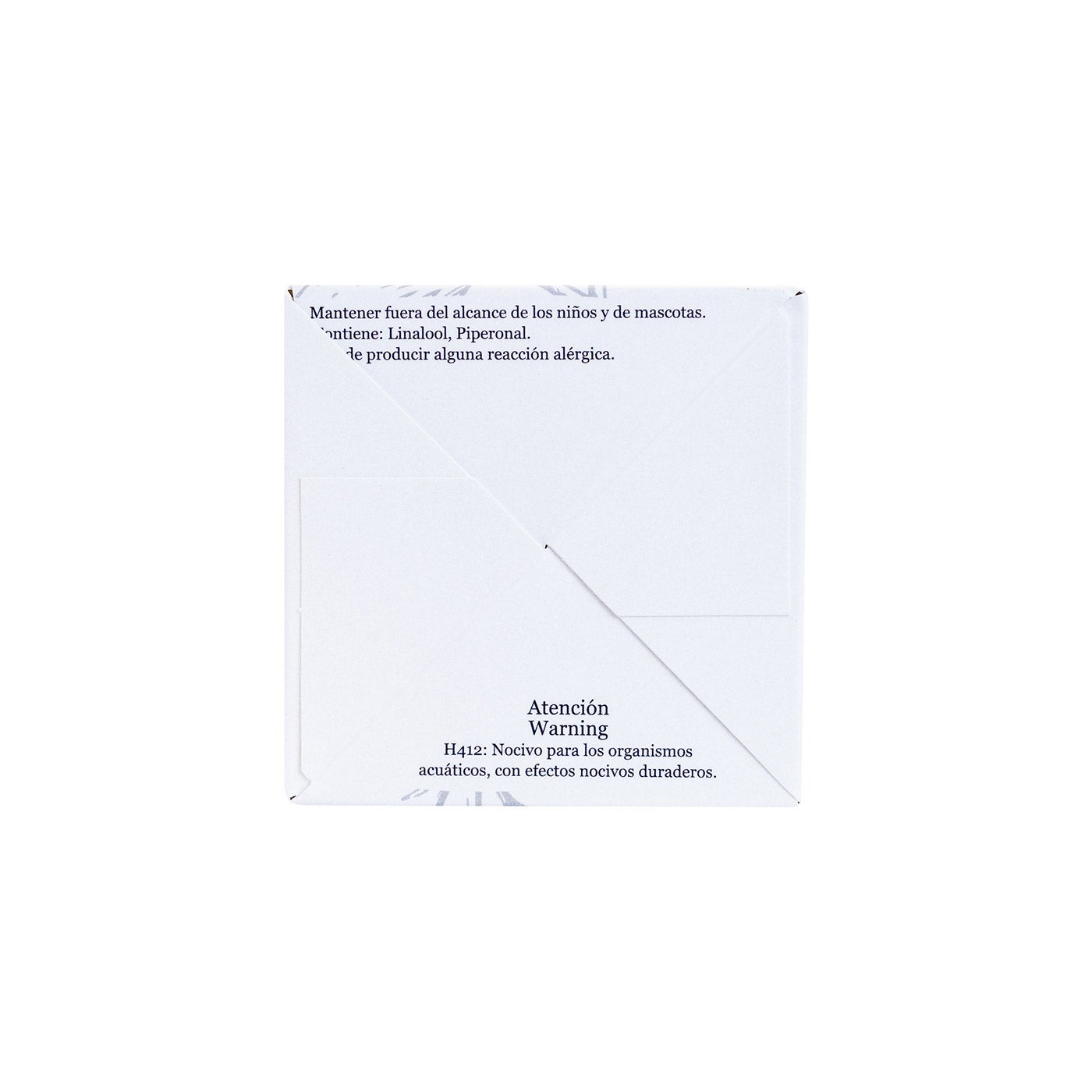 Mantener fuera del alcance de los niños y de mascotas. Contiene: Linalool, Piperonal. Puede producir alguna reacción alérgica.