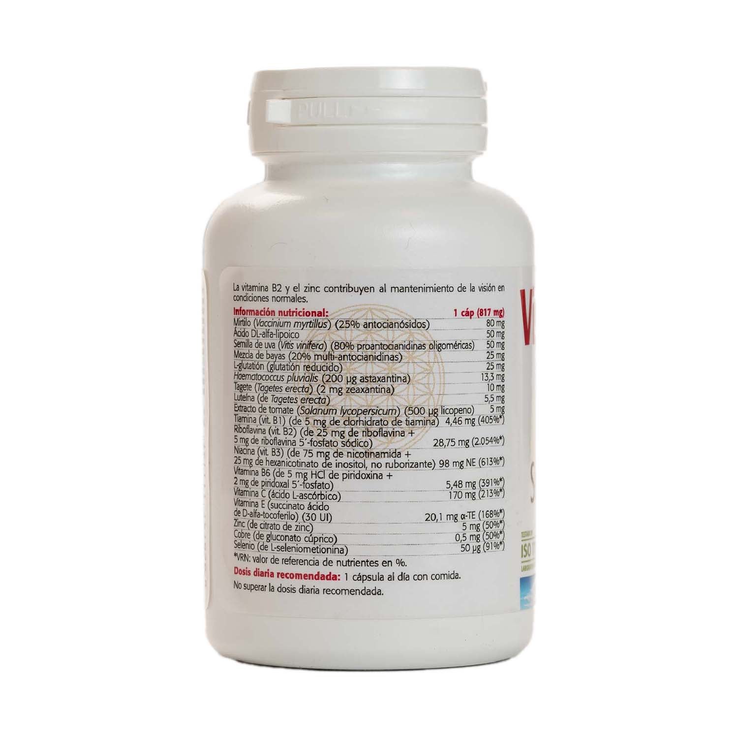 Visionamax cápsulas de Sura Vitasan. Complemento alimenticio a base de 21 ingredientes que proporcionan una cuidada seleccion de extractos de plantas como Mirtilo, Semilla de uva, carotenoides, glutation reducido, multi-antocianidinas, vitamina C, vitaminas del complejo B y minerales como zinc, cobre o selenio.