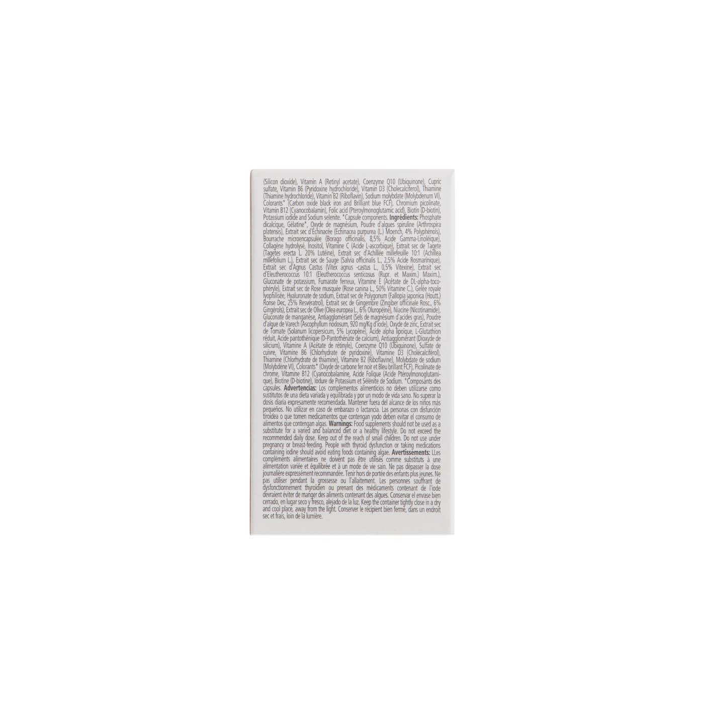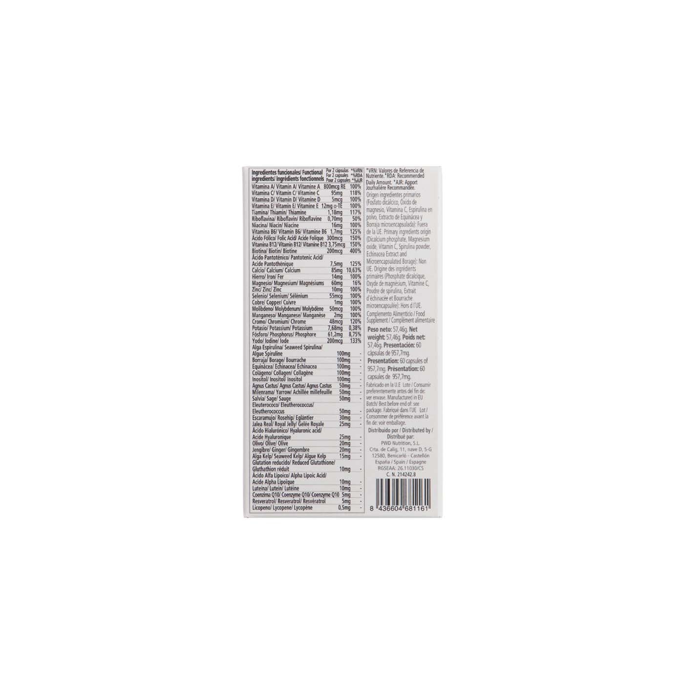 Fosfato dicálcico, Gelatina*, Óxido de magnesio, Alga Espirulina en polvo (Arthrospira platensis), Extracto seco de Equinácea (Echinacea purpurea (L.) Moench,, 4% Polifenoles), Borraja microencapsulada (Borago officinalis, 8,5% Ácido Gamma-Linoleico), Colágeno hidrolizado, Inositol, Vitamina C (Ácido L-Ascórbico), Extracto seco de Tagete (Tagetes erecta L. 20% Luteína), Extracto seco de Milenrama 10:1 (Achillea millefolium L.), Extracto seco de Salvia (Salvia officinalis L., 2,5% Ácido Rosmarínico), Extracto seco de Agnus Castus (Vitex agnus-castus L., 0,5% Vitexina), Extracto seco de Eleuterococo 10:1 (Eleutherococcus senticosus (Rupr. et Maxim.) Maxim.), Gluconato de potasio, Fumarato ferroso, Vitamina E (Acetato de DL-alfa-tocoferilo), Extracto seco de Escaramujo (Rose canina L., 50% Vitamina C.), Jalea real liofilizada, Hialuronato sódico, Extracto seco de Polygonum (Fallopia japonica (Houtt.) Ronse Dec, 25% Resveratrol), Extracto seco de Jengibre (Zingiber officinale Rosc., 6% Gingeroles), Extracto seco de Olivo (Olea europea L., 6% Oleuropeína), Niacina (Nicotinamida), Gluconato de manganeso, Antiaglomerante (Sales magnésicas de ácidos grasos), Alga Kelp en polvo (Ascophyllum nodosum, 920mg/Kg Yodo), Óxido de zinc, Extracto seco de Tomatera (Solanum licopersicum, 5% Licopeno), Ácido alfa lipoico, L-Glutatión reducido, Ácido Pantoténico (D-Pantotenato cálcico), Antiaglomerante (Dióxido de silicio), Vitamina A (Acetato de retinilo), Coenzima Q10 (Ubiquinona), Sulfato cúprico, Vitamina B6 (Clorhidrato de piridoxina), Vitamina D3 (Colecalciferol), Tiamina (Clorhidrato de tiamina), Vitamina B2 (Riboflavina), Molibdato de sodio (Molibdeno VI), Colorantes* (Óxido de hierro negro y Azul brillante FCF), Picolinato de cromo, Vitamina B12 (Cianocobalamina, Ácido Fólico (Ácido Pteroilmonoglutámico), Biotina (D-biotina), Yoduro de potasio y Selenito de sodio. *Componentes de la cápsula.