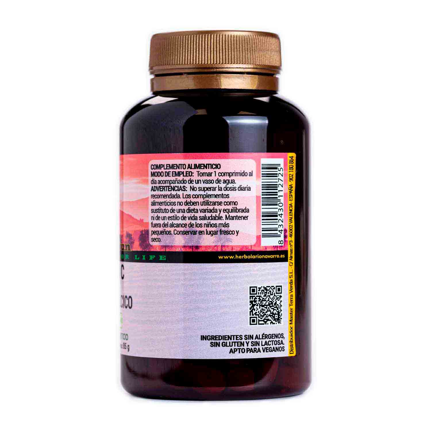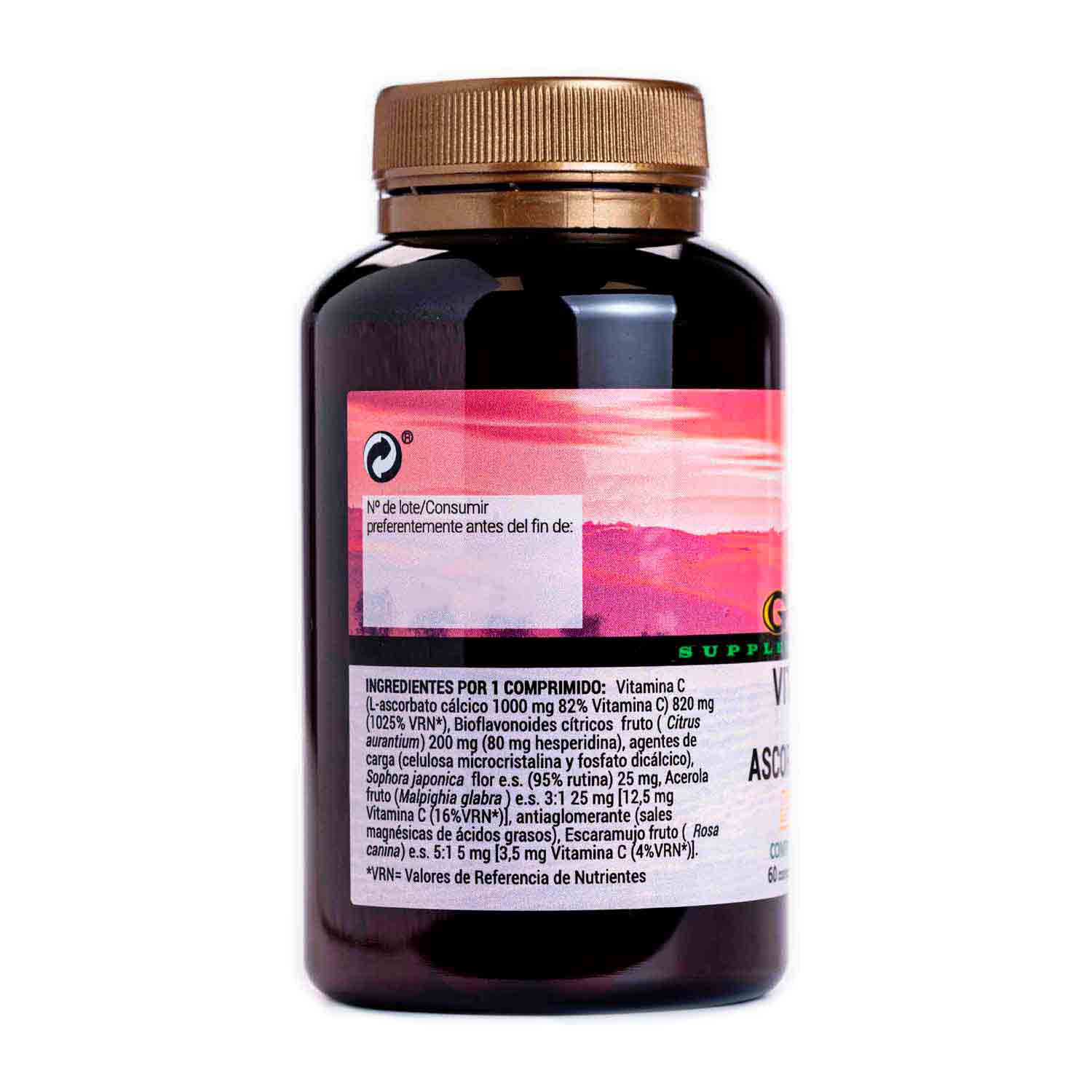 Ingredientes por 1 comprimido (Dosis diaria): Vitamina C (L-ascorbato cálcico 1000 mg 82% Vitamina C) 820mg (1025% VRN*), Bioflavonoides cítricos fruto (Citrus aurantium) 200 mg (80 mg hesperidina), agentes de carga (celulosa microcristalina y fosfato dicálcico), Sophora japonica flor e.s. (95% rutina) 25 mg, Acerola fruto (Malpighia glabra) e.s. 3:1 25mg (12,5mg Vitamina C (16% VRN*)), antiaglomerante (sales magnésicas de ácidos grasos), EScaramujo fruto (Rosa canina) e.s. 5:1 5mg (3,5 mg VitaminaC (4% VRN*)). *VRN=Valores de Refrencia de Nutrientes.