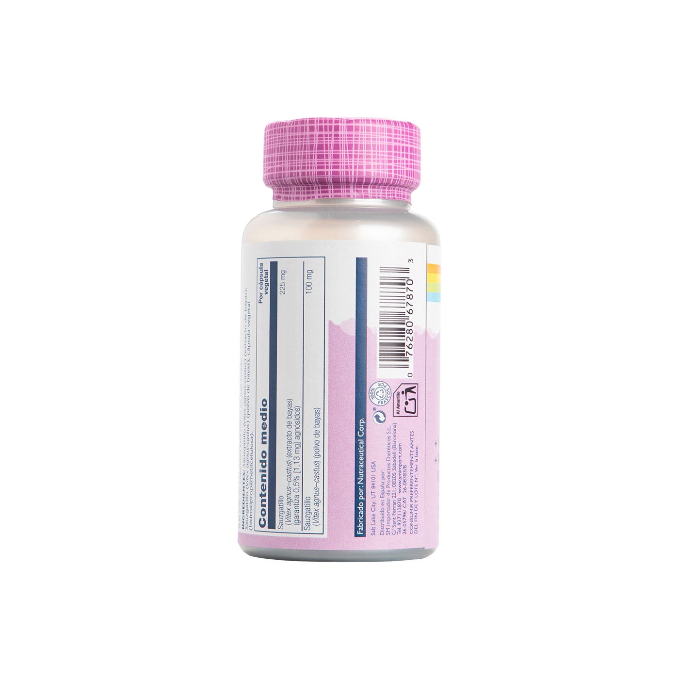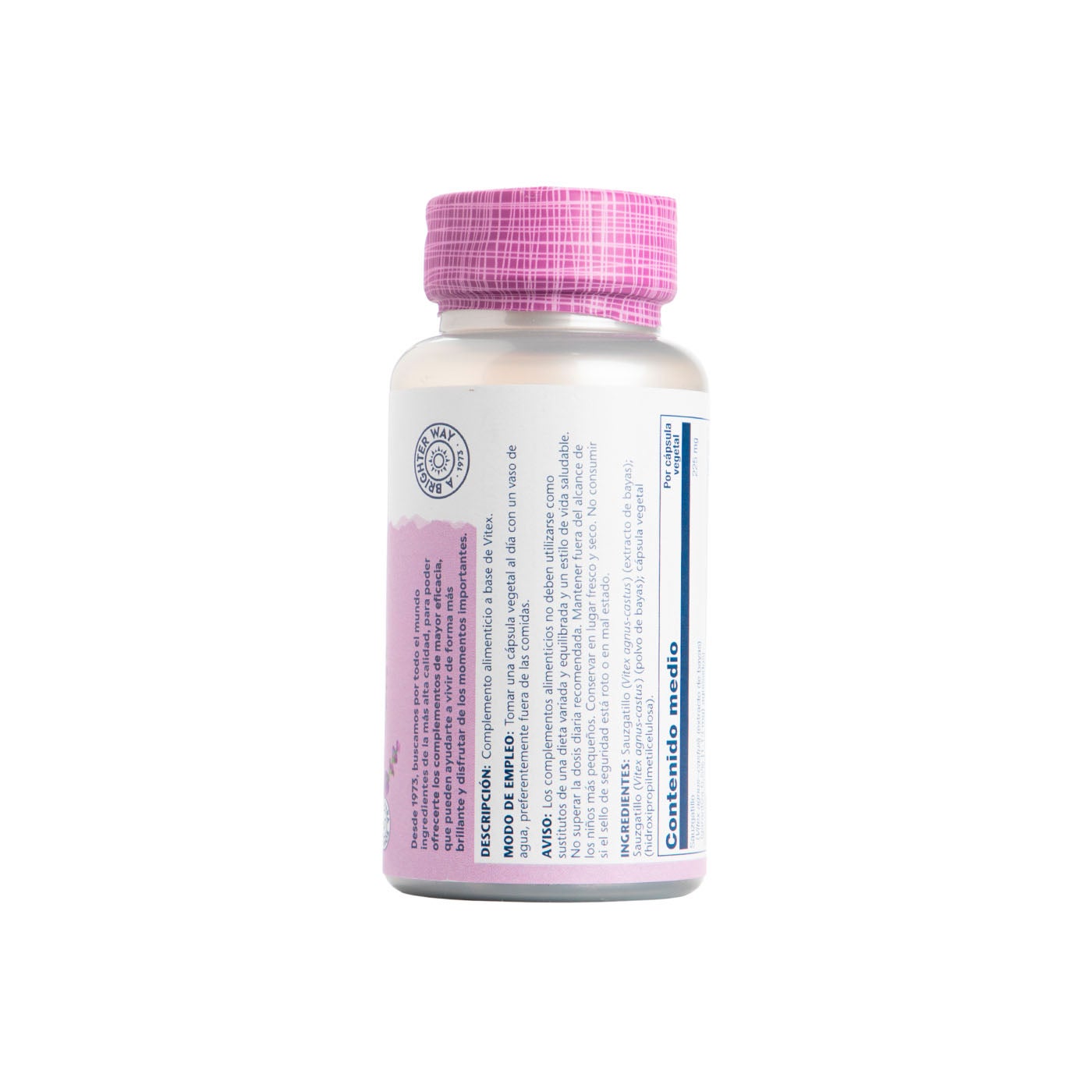 Complemento alimenticio elaborado a partir del Vitex agnus-castus, una planta tradicionalmente utilizada para el bienestar femenino. Solaray presenta el extracto estandarizado en cápsulas vegetales, que contienen principios activos presentes en las bayas del sauzgatillo, como los agnósidos.