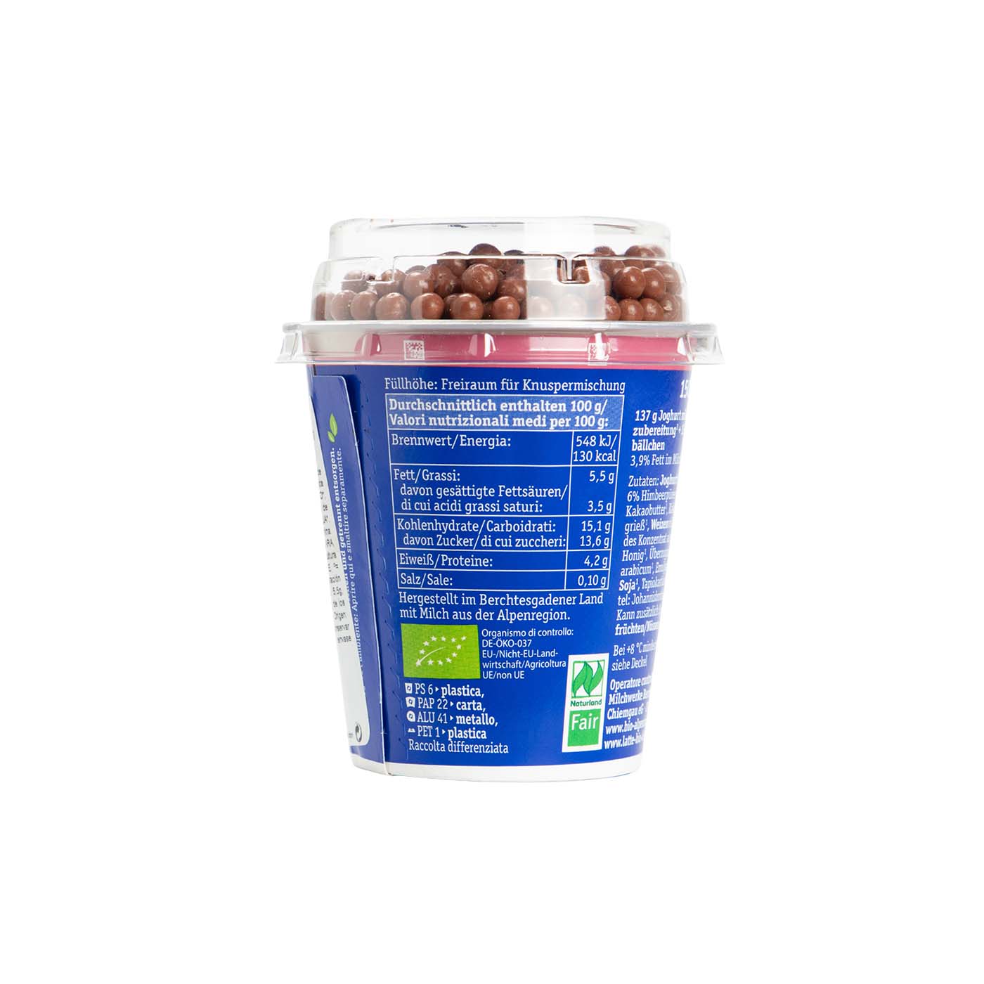 ¡Irresistiblemente divertido! El yogur de frambuesa con bolitas de choco de Berchtesgadener Land que alegra cada momento.